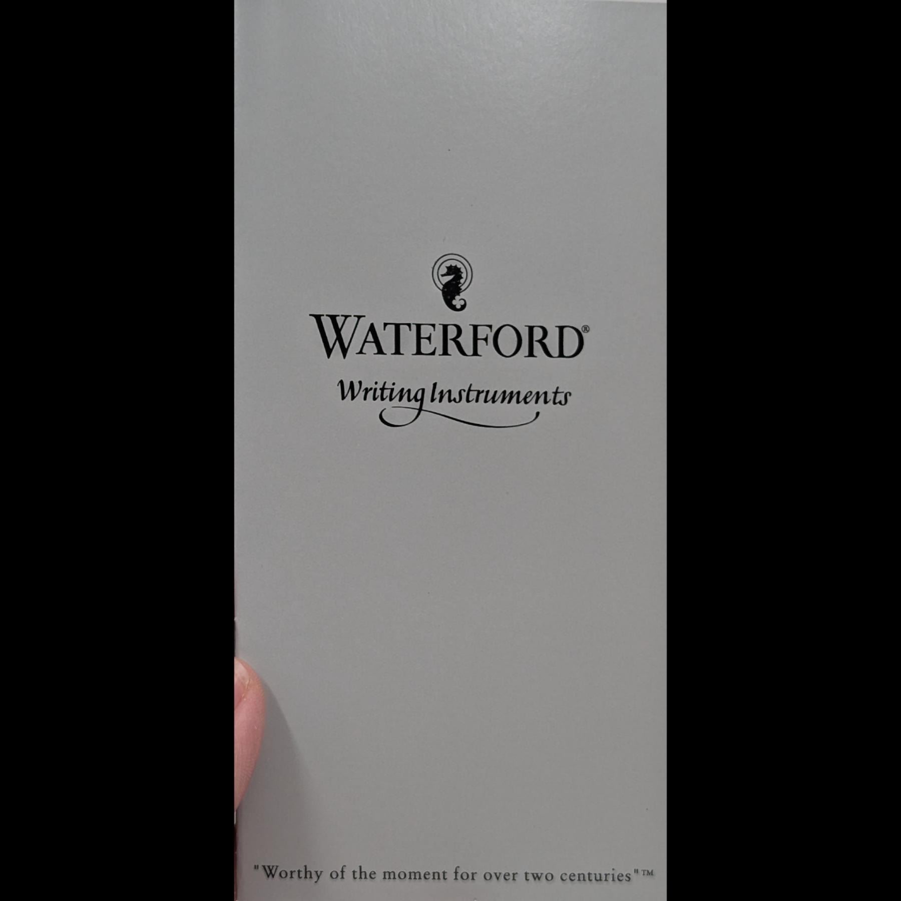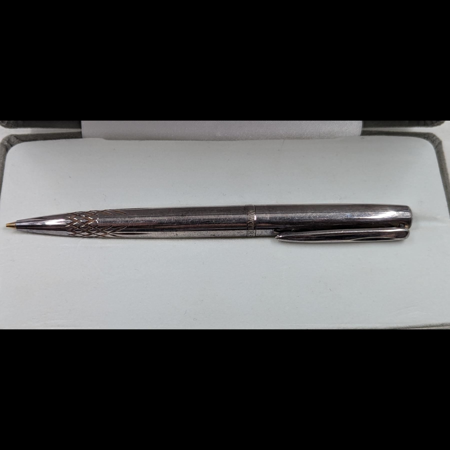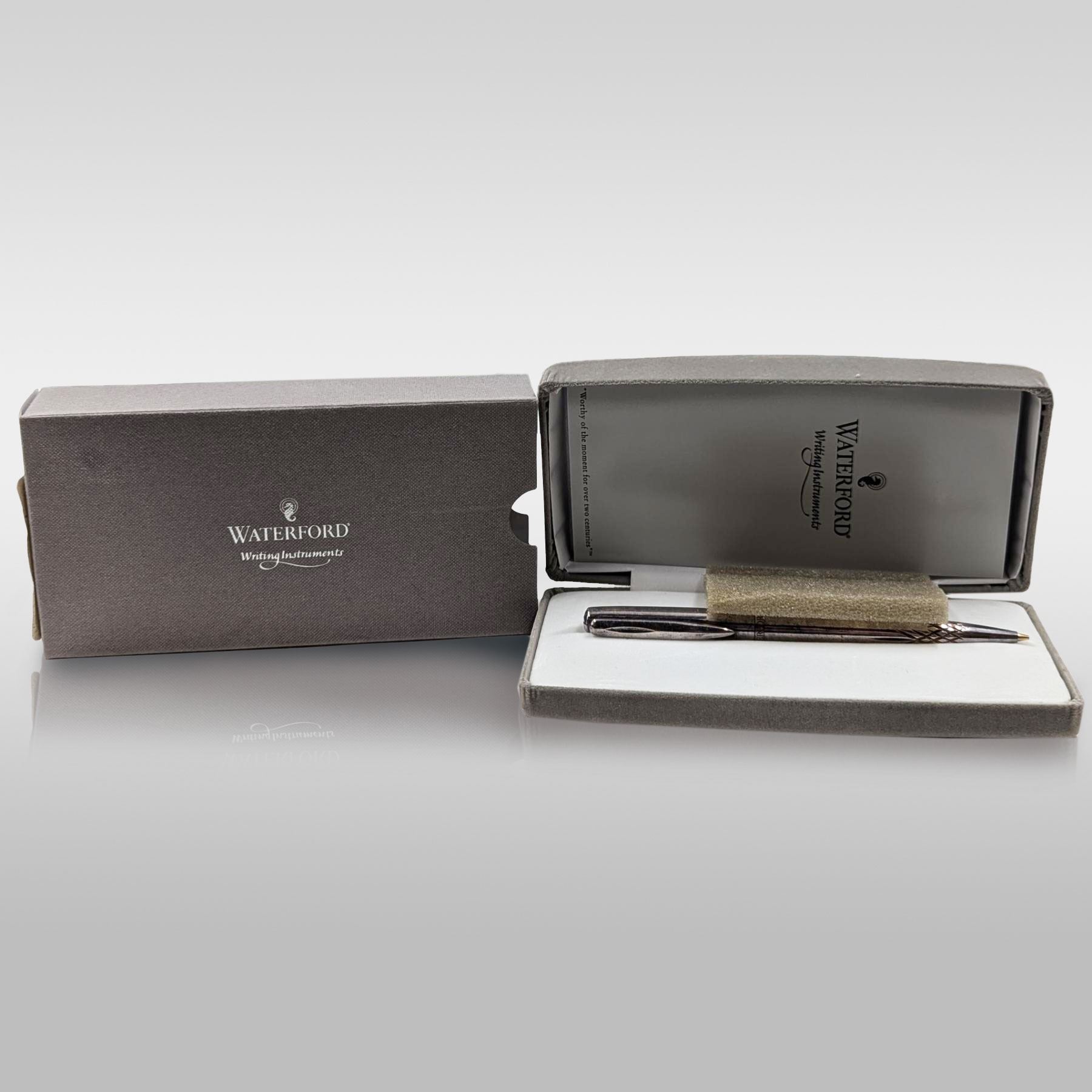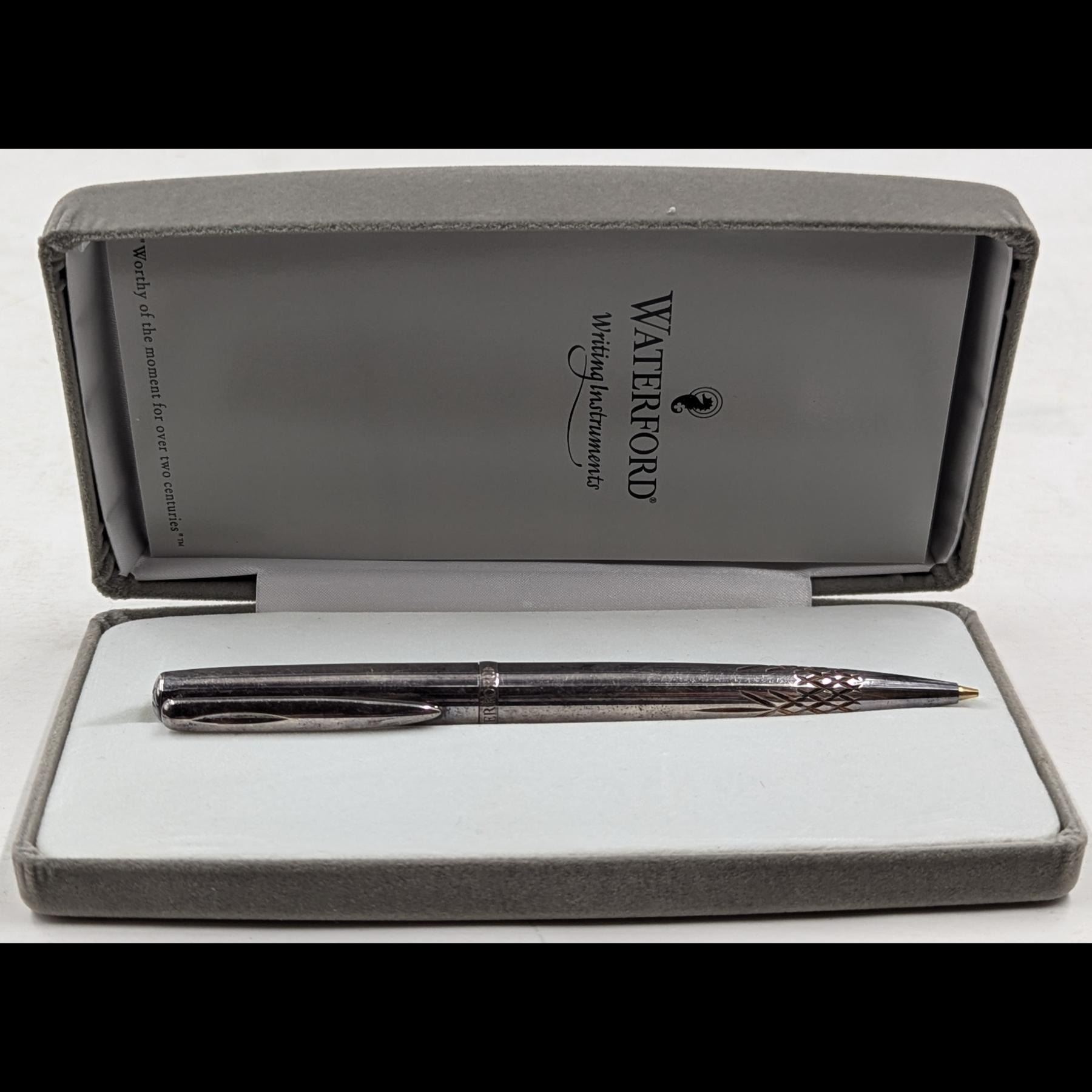 A Fine Waterford Line Platinum Finish Mechanical Pencil With Original Box/Case. Contains 0.5mm lead, advanced via cap twist, and engraved design on the base. Comes with included pamphlet.