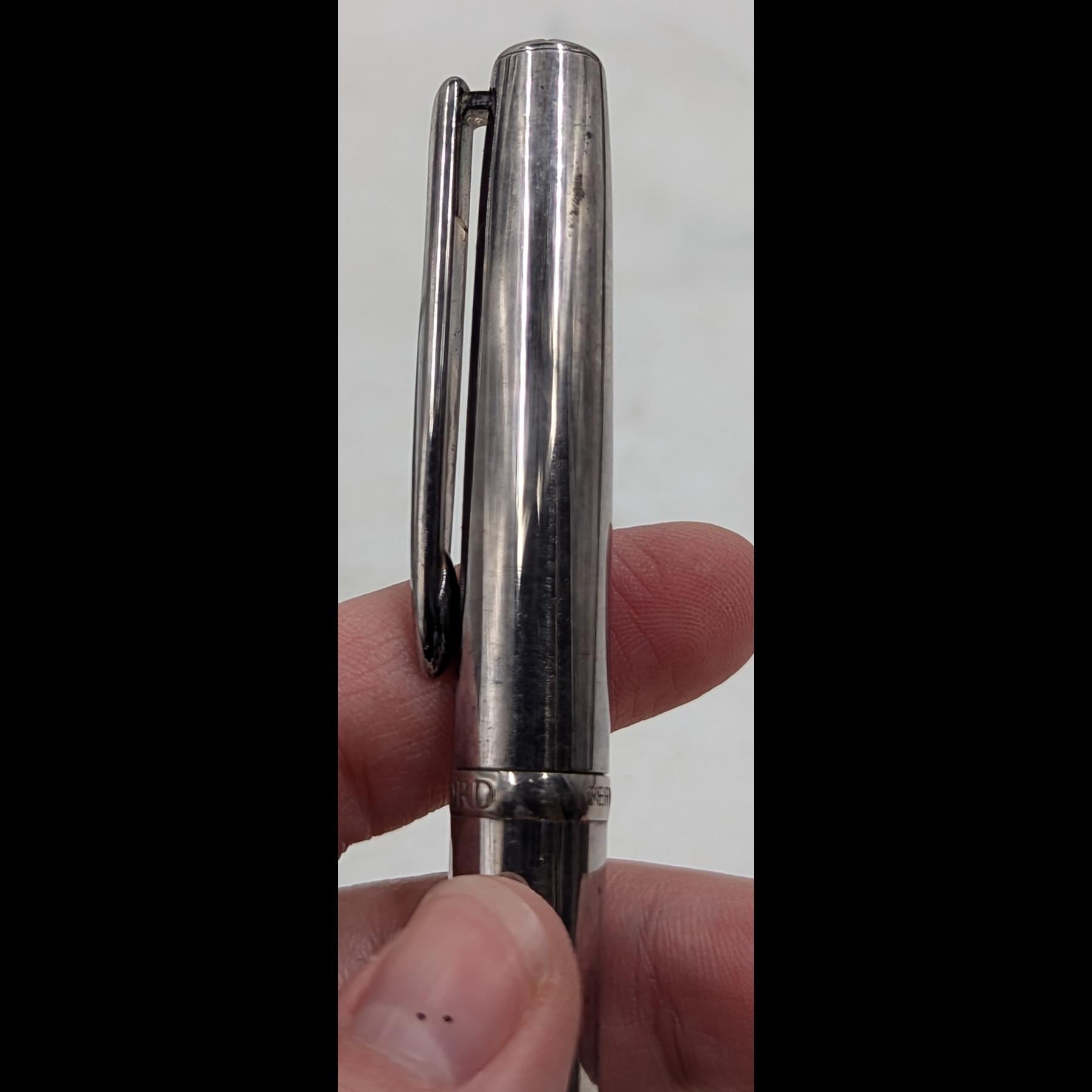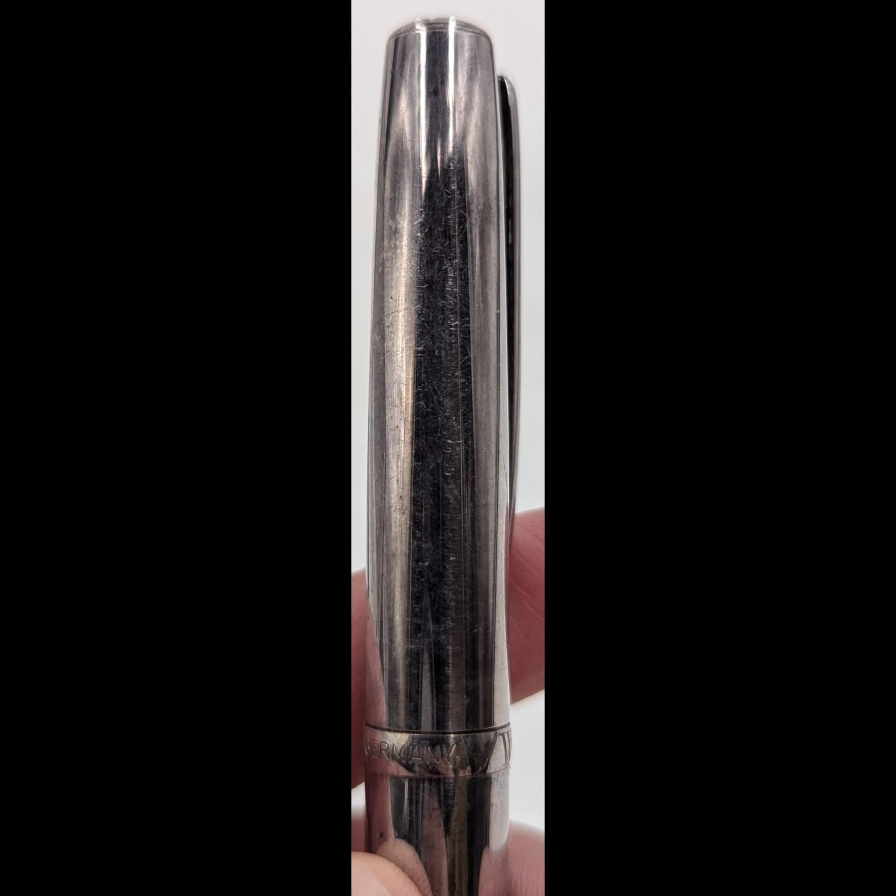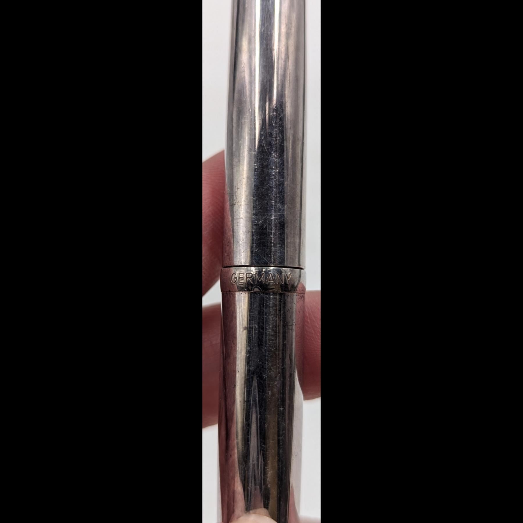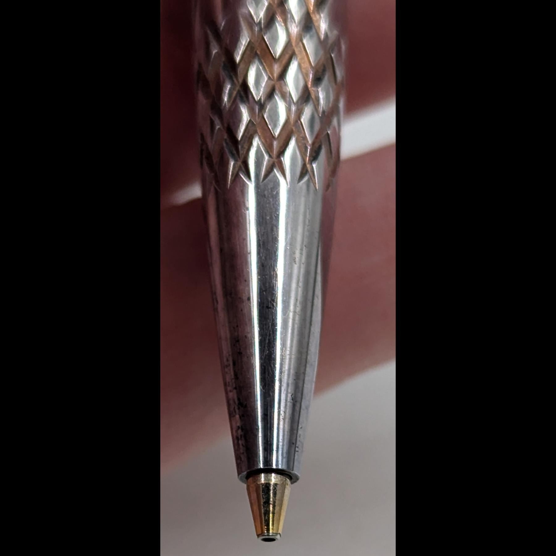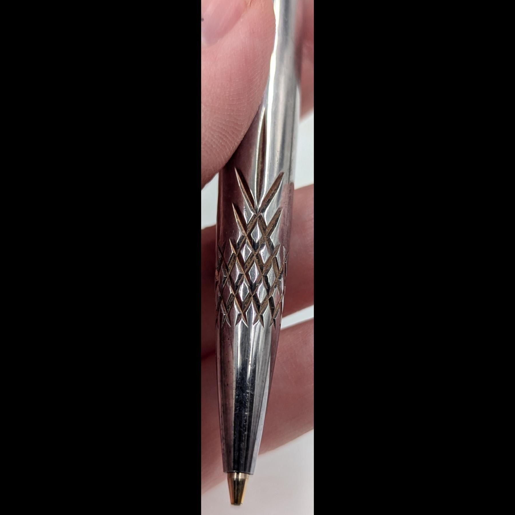 A Fine Waterford Line Platinum Finish Mechanical Pencil With Original Box/Case. Contains 0.5mm lead, advanced via cap twist, and engraved design on the base. Comes with included pamphlet.