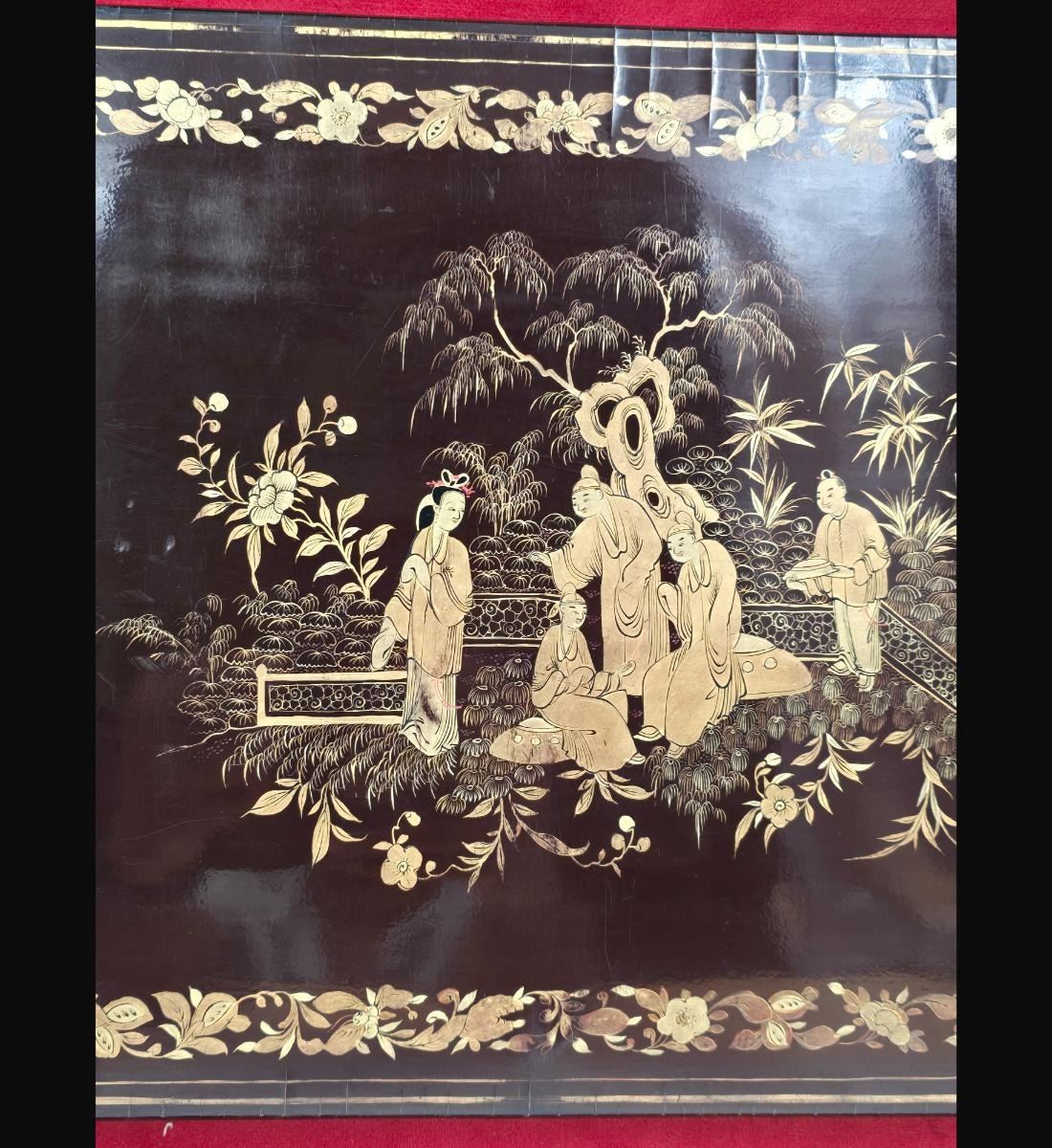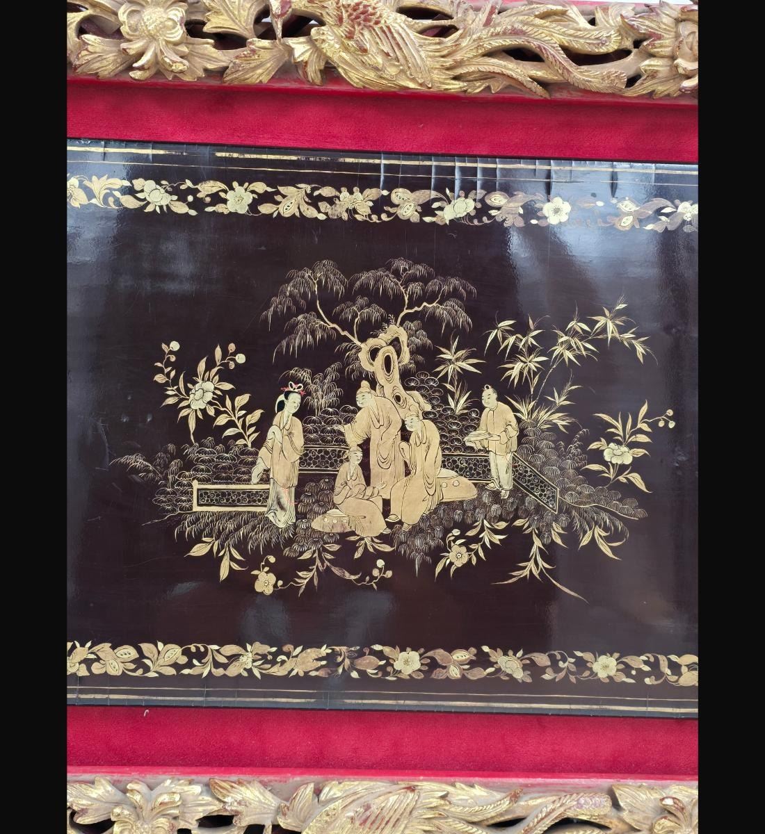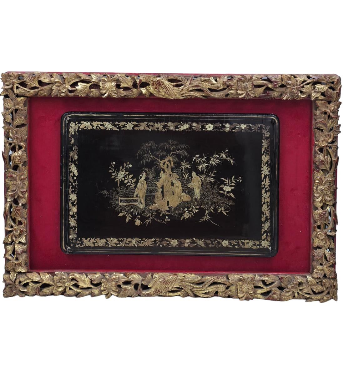 A Finely Gilt Painted Lacquered Chinese Panel With Carved Gilt Frame 19th Century