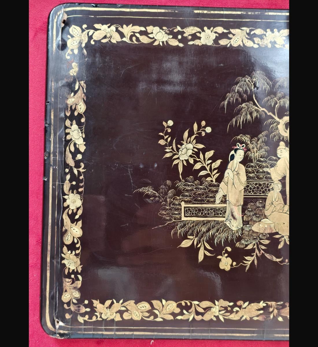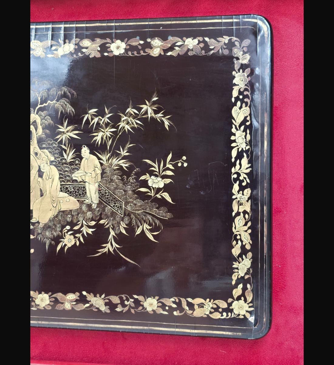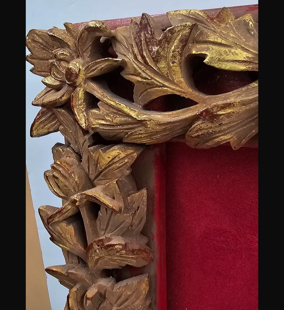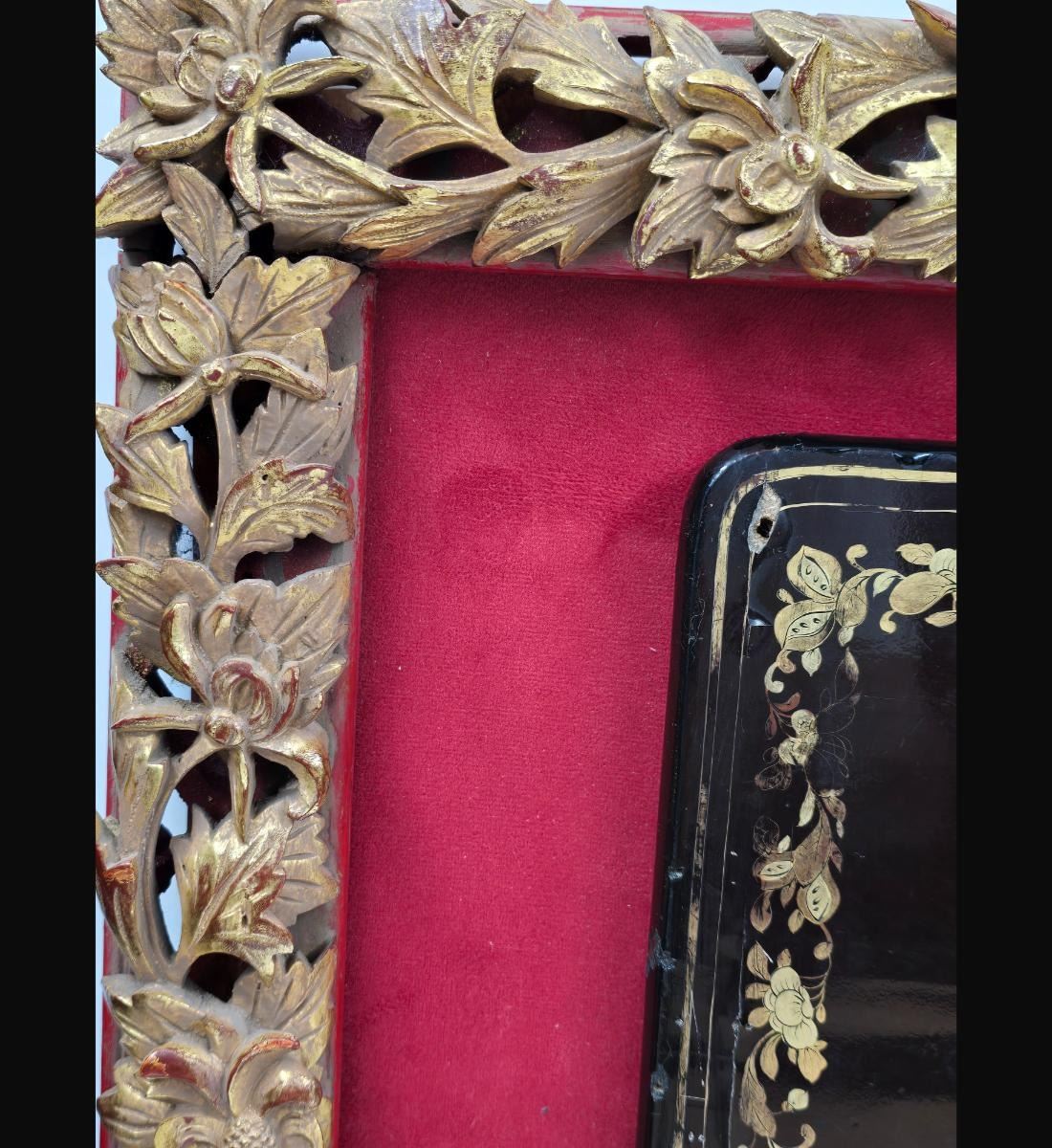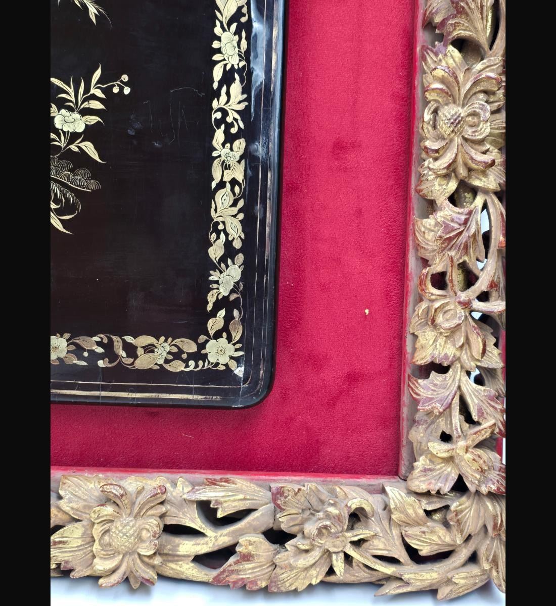 A Finely Gilt Painted Lacquered Chinese Panel With Carved Gilt Frame 19th Century. Framed Measure 17.5" X 25, Panel 11" X 17"". Provenance: One Person Private Estate Central Florida.