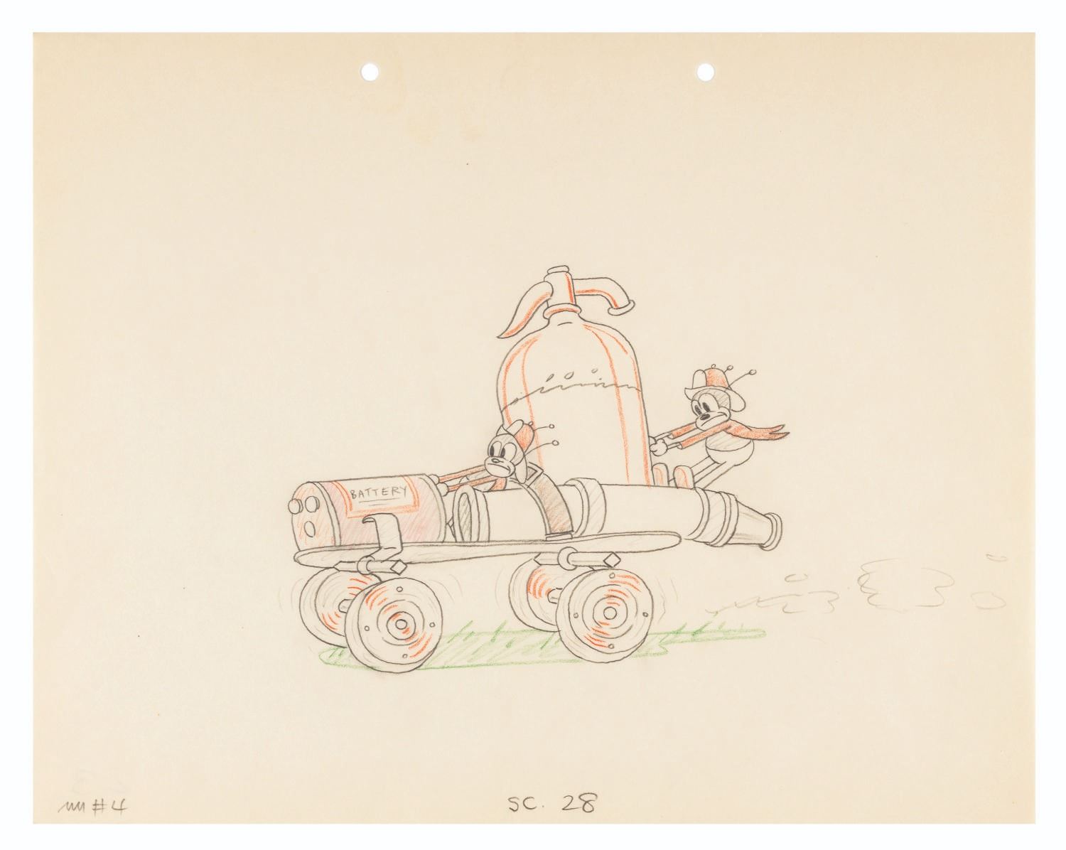 (Schlesinger, 1934) An original production drawing of fire fighting bugs from the Merrie Melodies short “Honeymoon Hotel,” directed by Earl Duvall. Accomplished in graphite and colored pencil with a character image size of 5” x 6”, the 9.5” x 12” drawing is in fine condition.