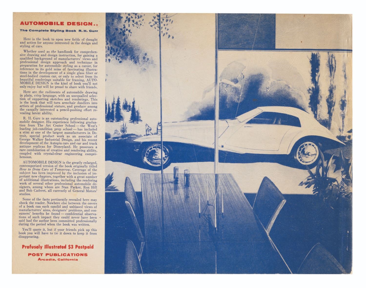 (Post Motor, 1955) A first edition of "Automobile Design" by Bob Gurr. This 96-page publication features automobile renderings with instructions on drawing, design, and styling. Measuring 11"x8.5", this book is in very good condition with some discoloration and edge wear.