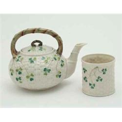 A First period Belleek teapot, moulded with shamrocks against a woven-effect ground, 6ins and a n...