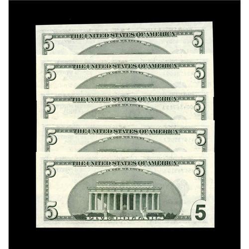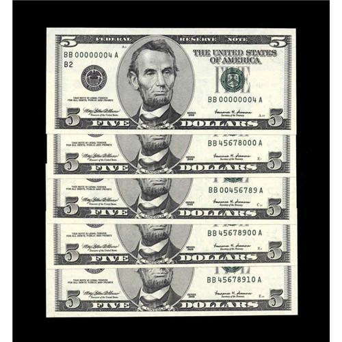 <B>A Fistful of Fancies, All Fr. 1986-B $5 1999 Federal Reserve Note. Gem Crisp Uncirculated.</B></I><BR> The Serial Numbers in this lot start with a single digit, 4. Included are, BB00000004A, BB00456789A, BB45678000A, BB45678900A, and finally BB45678910A.<BR><I>From the Scottsdale Collection</B></I>