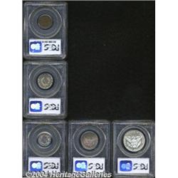 <B>A Five Piece 1911 Proof Set PR66 to PR67 PCGS.</B></I> The set includes: <BR><BR> <B>Cent PR66 Red and Brown.</B></I> Golden-brown color dominates the reverse, while lilac hues endow the majority of the reverse. An exquisitely struck and seemingly immaculate premium Gem. Population: 13 in 66 Red and Brown, none finer (3/04).<BR><BR> <B>Nickel PR66 Cameo.</B></I> A well struck specimen that exhibits lovely powder-blue and peach colors. The obverse is essentially flawless, and the reverse has only a couple of minute flecks of green debris. Population: 10 in 66 Cameo, 5 finer (3/04).<BR><BR> <B>Dime PR66.</B></I> A magnificently struck premium Gem with flashy mirrors and deep olive, rose, and aquamarine patina. A beautiful example of this low mintage issue. Population: 27 in 66, 17 finer (3/04).<BR><BR> <B>Quarter PR67.</B></I> Iridescent apricot, sea-green, orange, and rose-pink colors enrich each side. A razor-sharp strike and undisturbed surfaces further the eye appeal of this imposing specimen. The Barber Dime, Quarter, and Half Dollar for this year each have a scant production of only 543 pieces. Population: 22 in 67, 7 finer (3/04).<BR><BR> <B>Half Dollar PR66 Cameo.</B></I> The snow-white devices have pleasing contrast with the mirrored fields, and the untoned surfaces are essentially pristine. This sharply struck premium Gem would be a highlight of any proof Barber collection. Population: 7 in 66 Cameo, 1 finer (3/04). 5 coins <BR><BR><B>Important notice:</B> Heritage usually auctions material at the rate of 200-250 lots per hour. On some occasions eBay Live bid software or the Internet may not be able to keep up with the pace of the auction. We recommend placing a realistic absentee bid now as insurance to avoid disappointment. Occasionally the auctioneer may eliminate or reject an eBay Live bid, and the auctioneer may also reopen a lot after the close of the eBay live bidding (usually because we missed an audience bid), and may reject your bid even if it shows you as the winning bidder. By bidding via eBay Live, you agree that Heritage may award the lot to another bidder at its sole discretion under the circumstances described above or any other reasonable circumstances. Since eBay bids are not shown to us until we open the lot on the floor, we treat those bids just like floor bids. In most cases the floor responds before the eBay bid is presented to us, due to Internet lag time, so for consistency we have made it a policy that floor bids are always considered first over tie eBay live bids. Also please note that all Heritage lots purchased through eBay Live carry a 20% Buyer's Premium. Please make sure you read the Terms and Conditions before you bid.