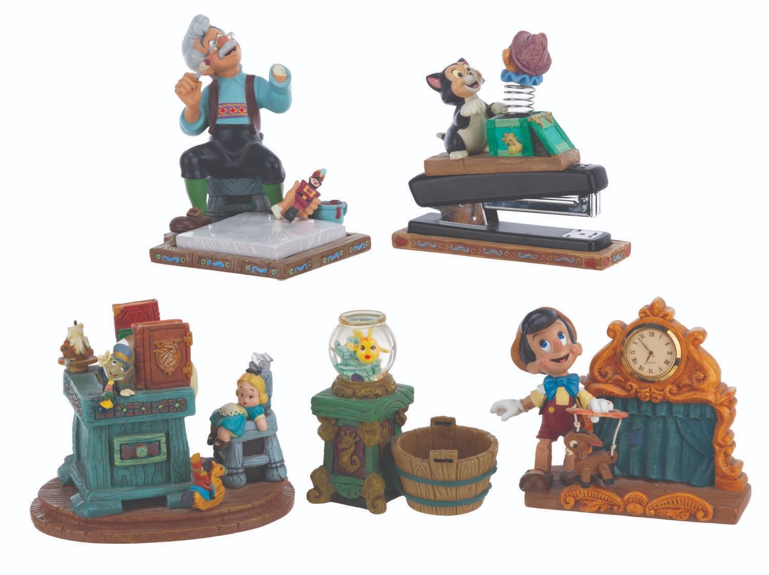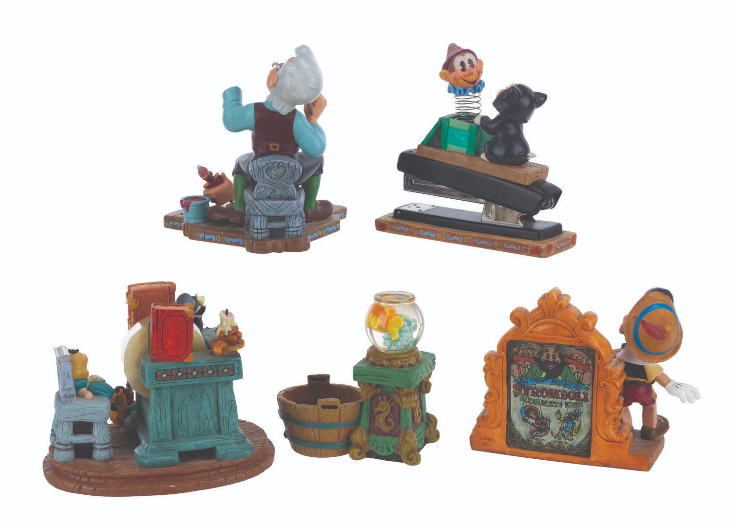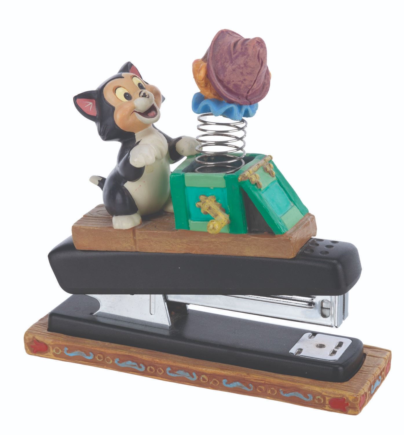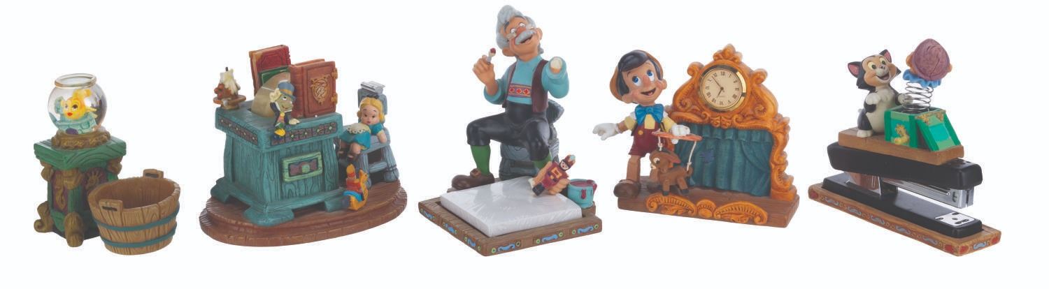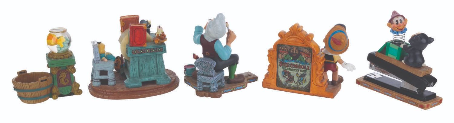 (Disney, 1990s-2000s) A five piece “Pinocchio” desk set produced by the Disney Catalog. The delightful figural set includes a Pinocchio business card holder with clock, Cleo paperclip holder, Figaro stapler, Jiminy Cricket tape dispenser, and Geppetto Post-It Note stand. Measuring 5.75” tall and under, the set is overall in very good condition, with a scuff to Figaro’s nose, and the Geppetto piece in poor condition due to a broken hand.