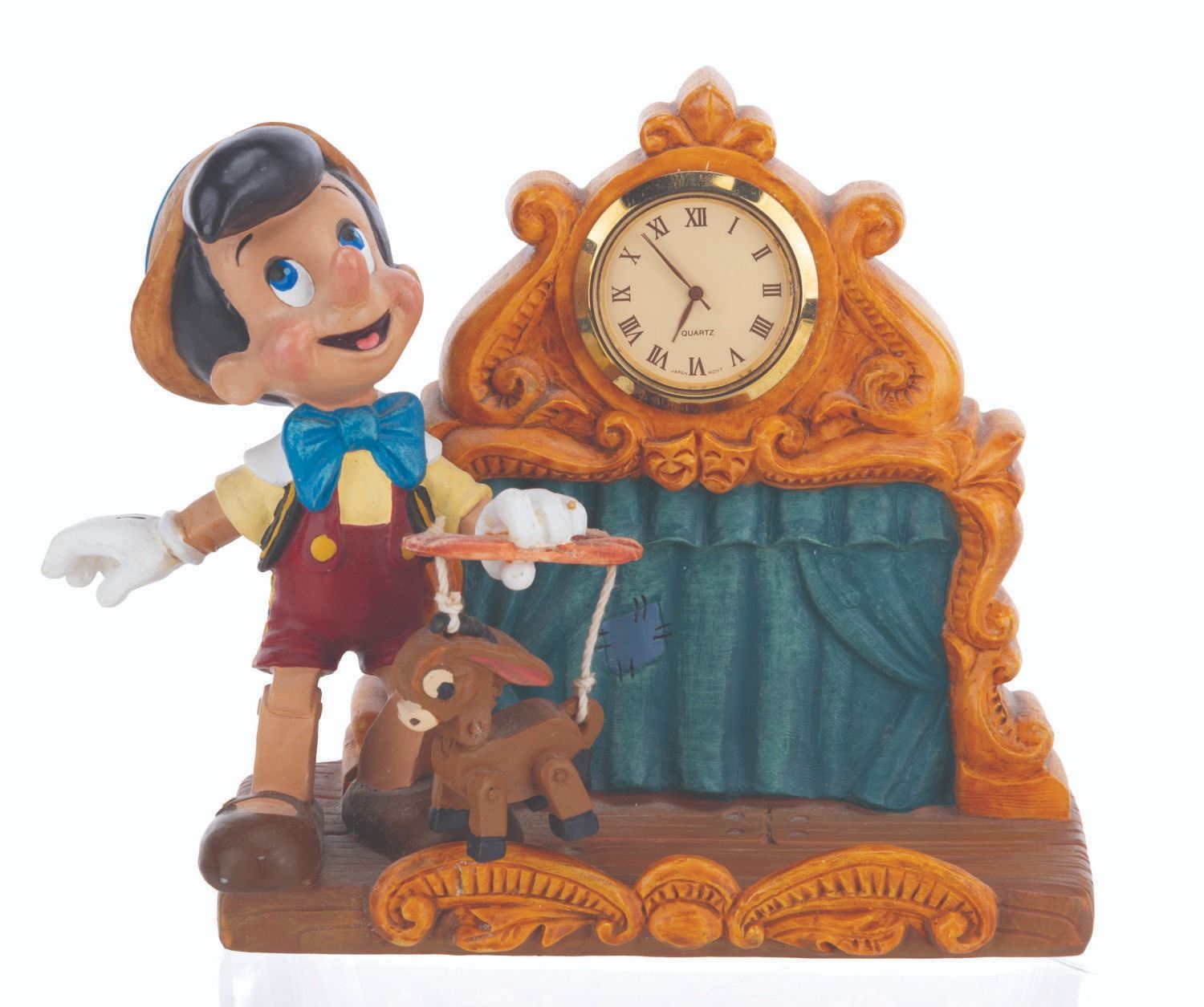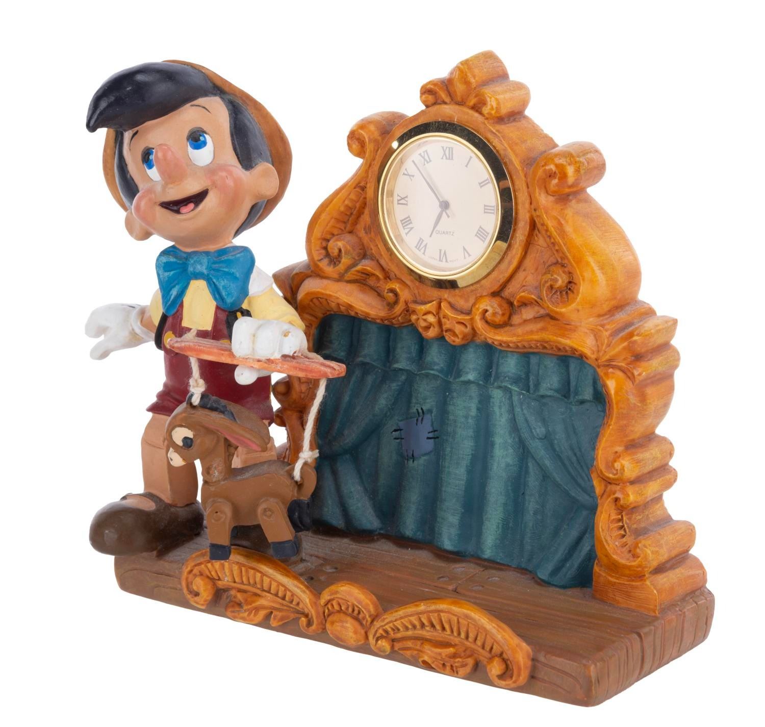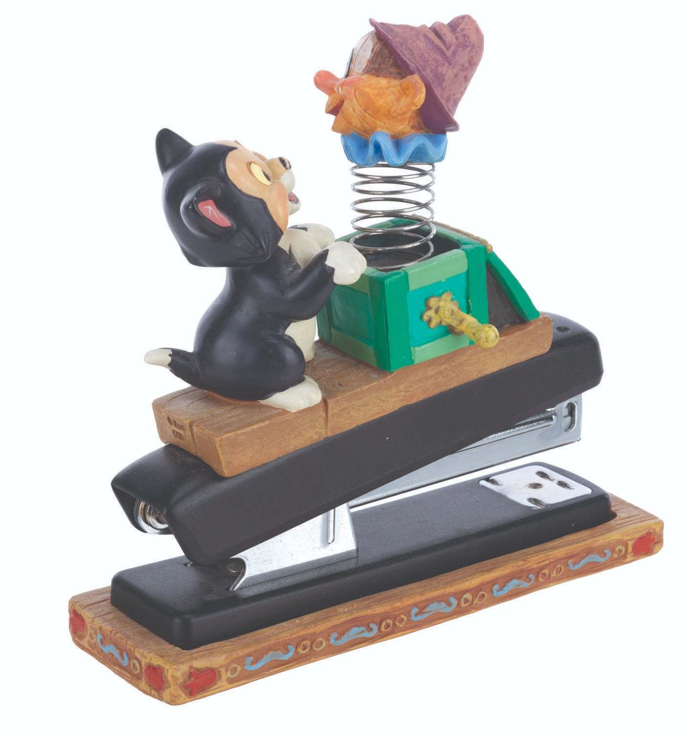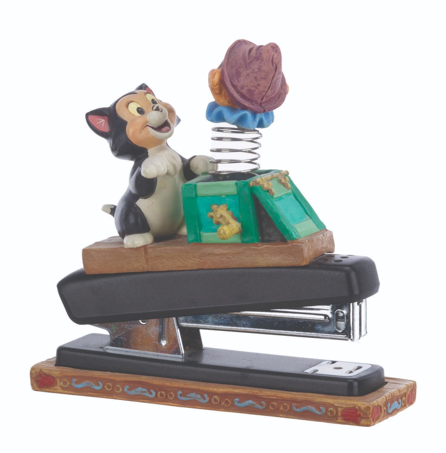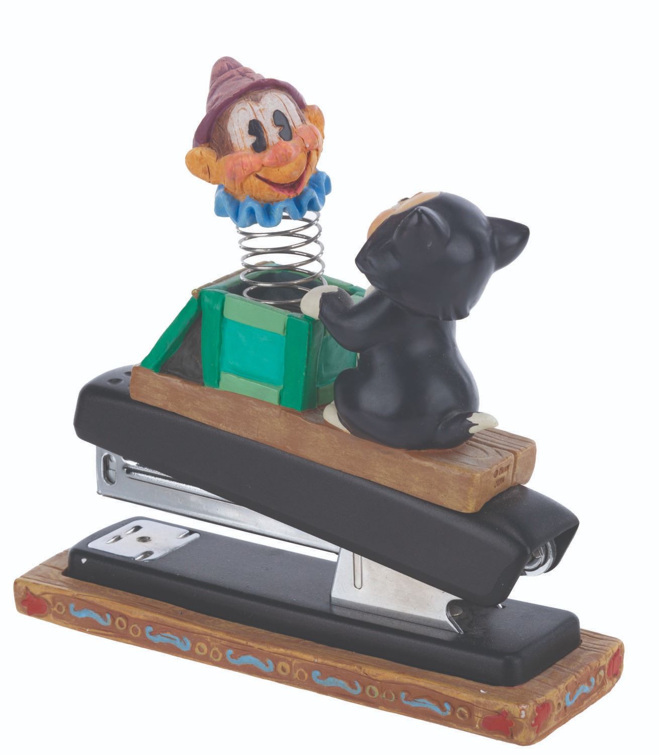 (Disney, 1990s-2000s) A five piece “Pinocchio” desk set produced by the Disney Catalog. The delightful figural set includes a Pinocchio business card holder with clock, Cleo paperclip holder, Figaro stapler, Jiminy Cricket tape dispenser, and Geppetto Post-It Note stand. Measuring 5.75” tall and under, the set is overall in very good condition, with a scuff to Figaro’s nose, and the Geppetto piece in poor condition due to a broken hand.