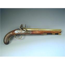 A Flintlock pistol by 'Bunny, London', the brass octagonal and turned barrel with engraved lock and hatched butt