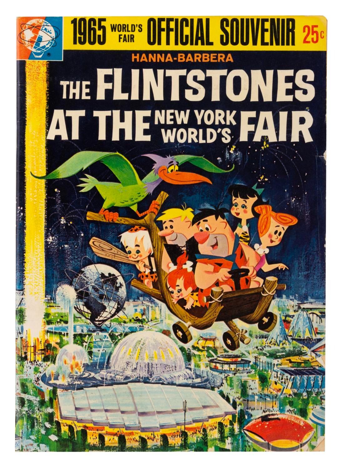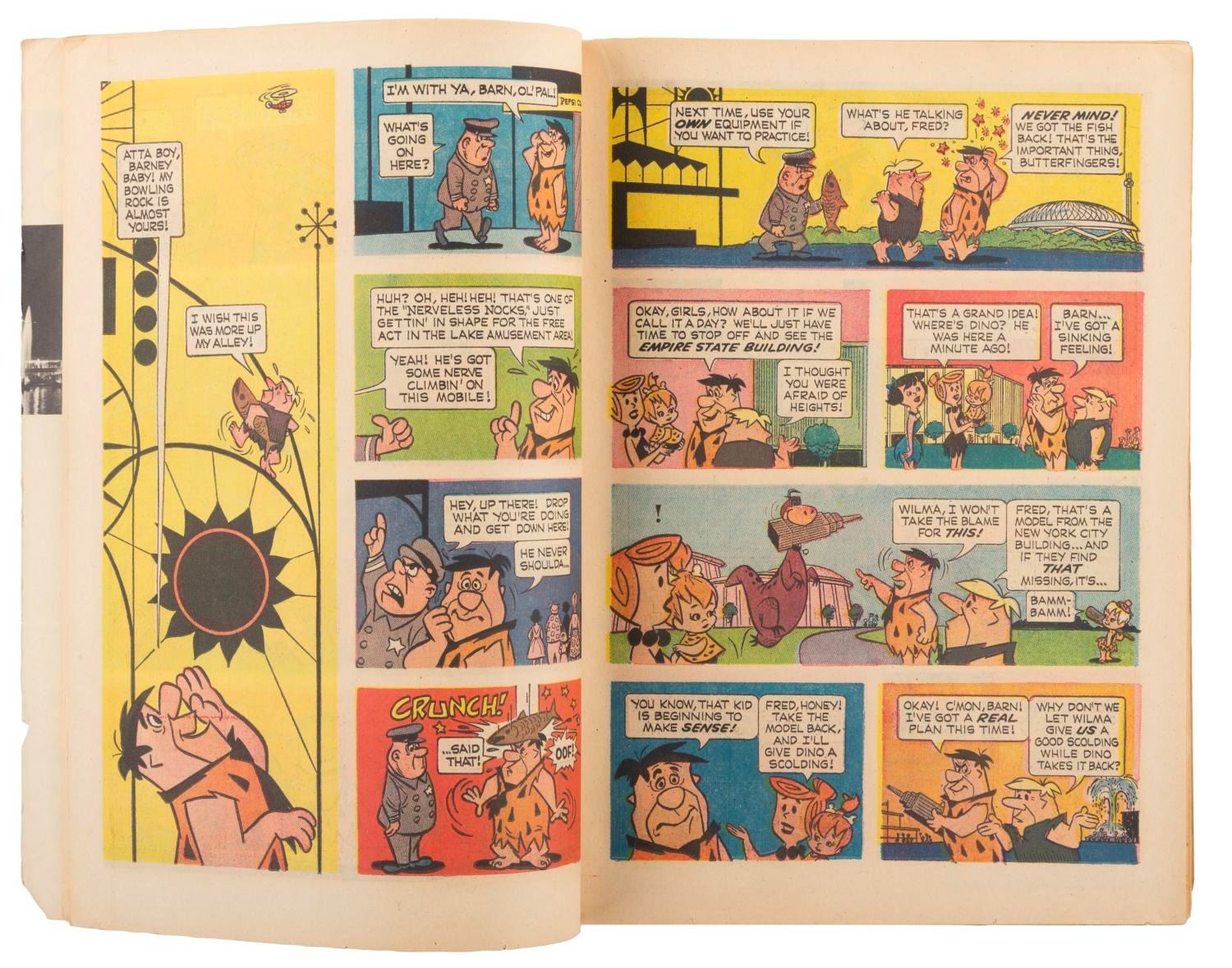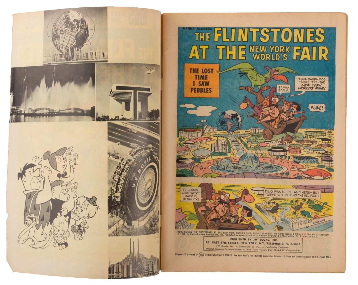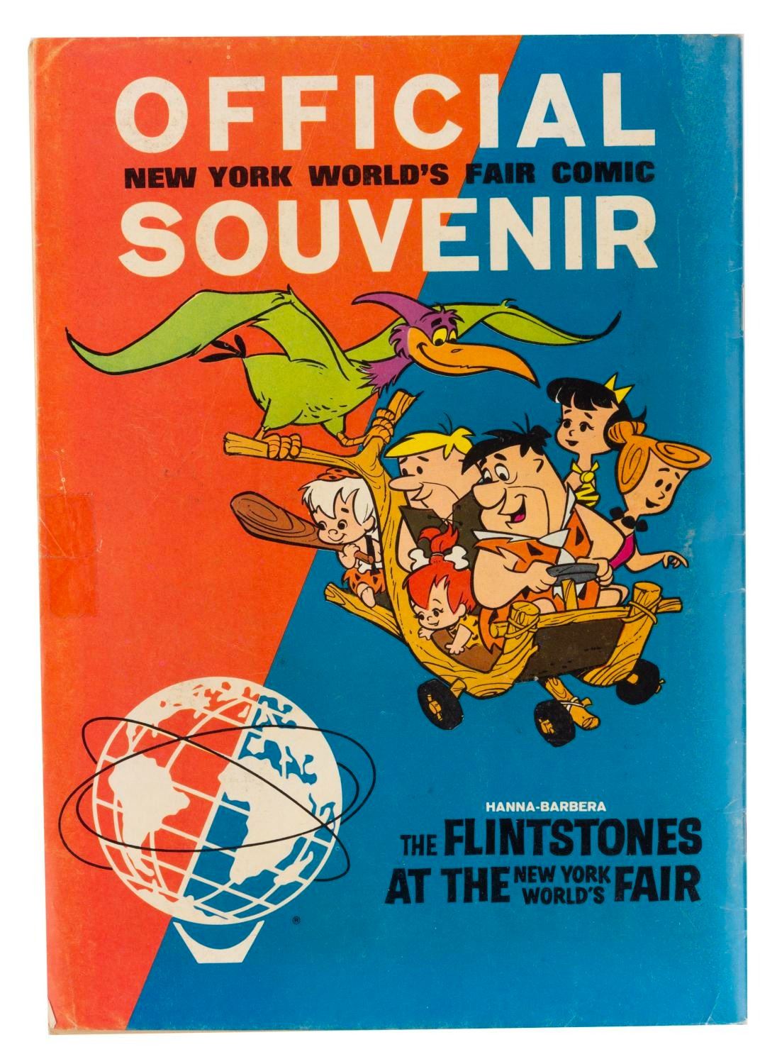 (Hanna-Barbera, 1965) A comic book featuring the misadventures of "The Flintstones" at the 1964-65 New York World's Fair. Measuring 7.25" x 10.25", the comic book is in very good condition with light handling wear, minimal edge wear, a taped tear and scuffing on the reverse, small tears and creases to the front cover.