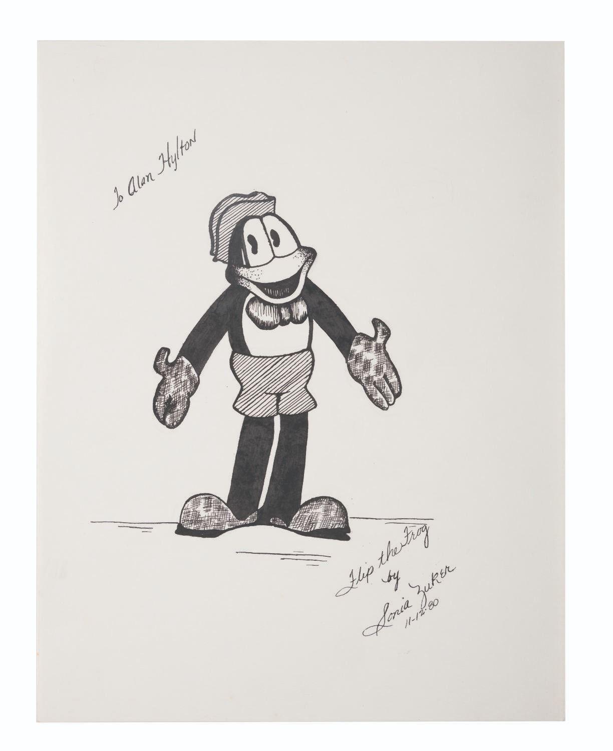 (1980) A Flip the Frog drawing signed by Sonia Zuker with a dedication. Accomplished in ink, the drawing has a character size of 6" x 4.5" on 9” x 11.75" cardstock and is in fine condition