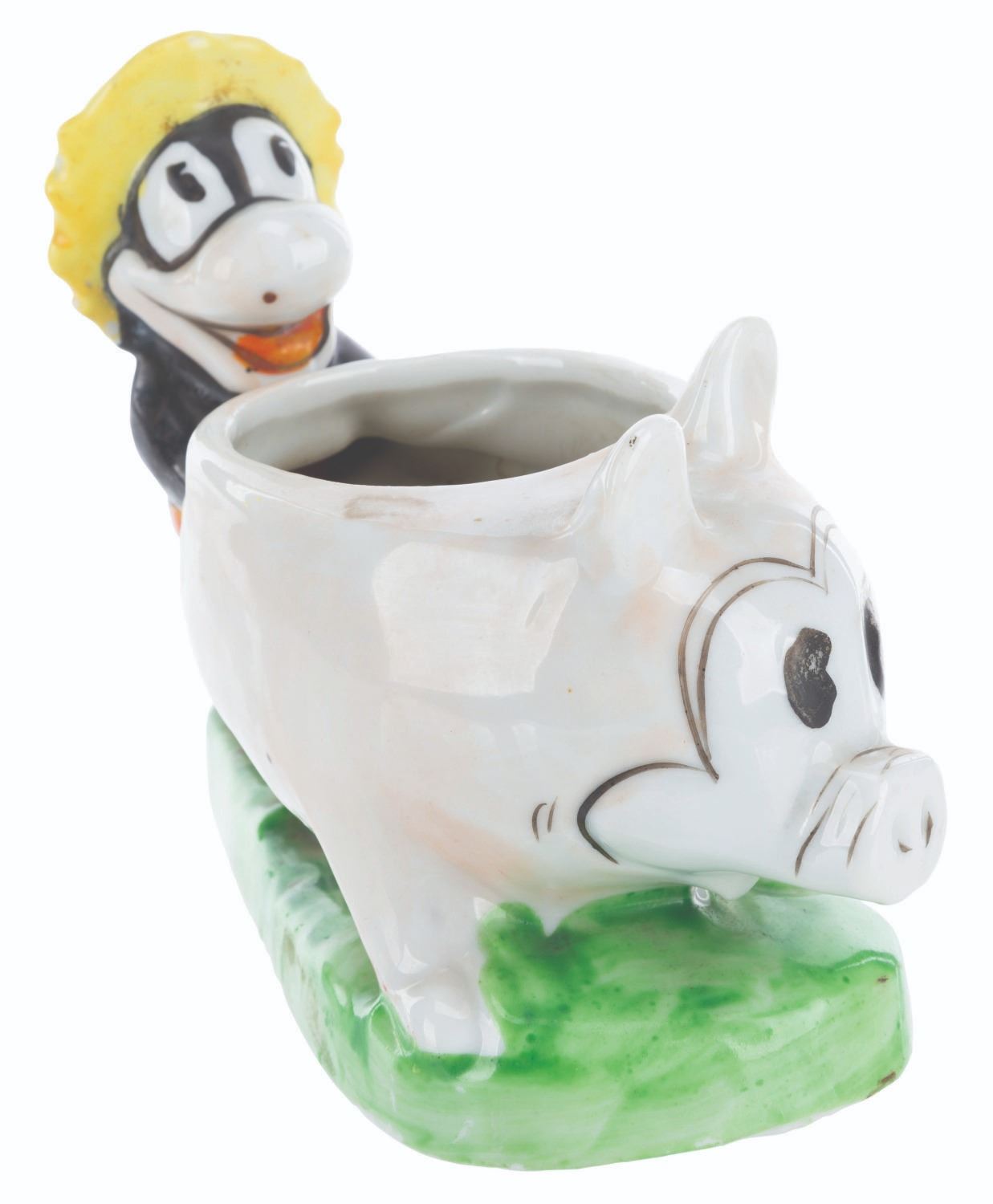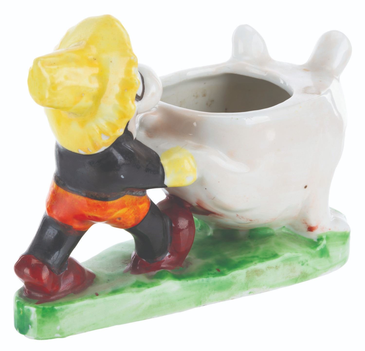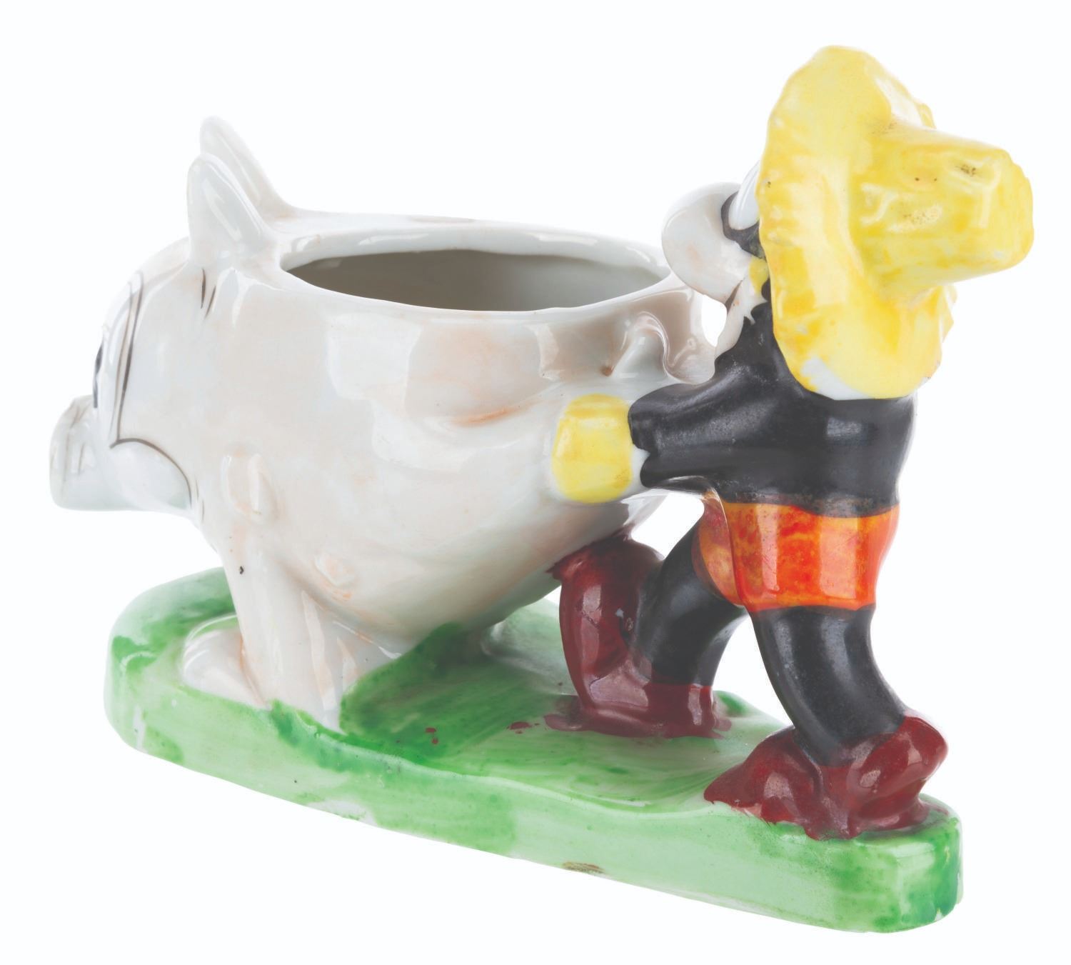(Japan, 1930s) A Flip the Frog ceramic planter depicting the Iwerks' character using a pig as a partner in a wheelbarrow race. Measuring 6.25” x 3” x 5” tall, the planter is in good condition with paint loss, stains, smudges, scuffs, and wear. Ub Iwerks, the animator chiefly responsible for the design and animation of the first 15 Mickey Mouse shorts, left the Disney Studio in 1930 after a falling out with Walt. Ub set up Iwerks Studio to produce a series of cartoons with all new characters, most famously, Flip the Frog. Flip starred in only 15 cartoons over a period of three years before being dropped by distributor MGM. Unlike his contemporary rival, Mickey Mouse, merchandise featuring the character is incredibly rare, particularly pieces in good condition such as the ones offered here.