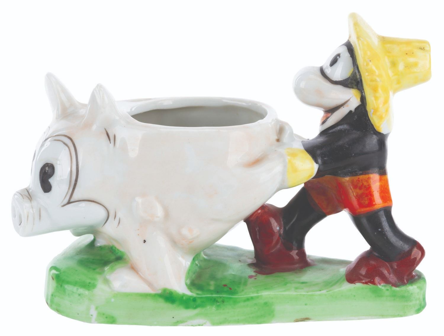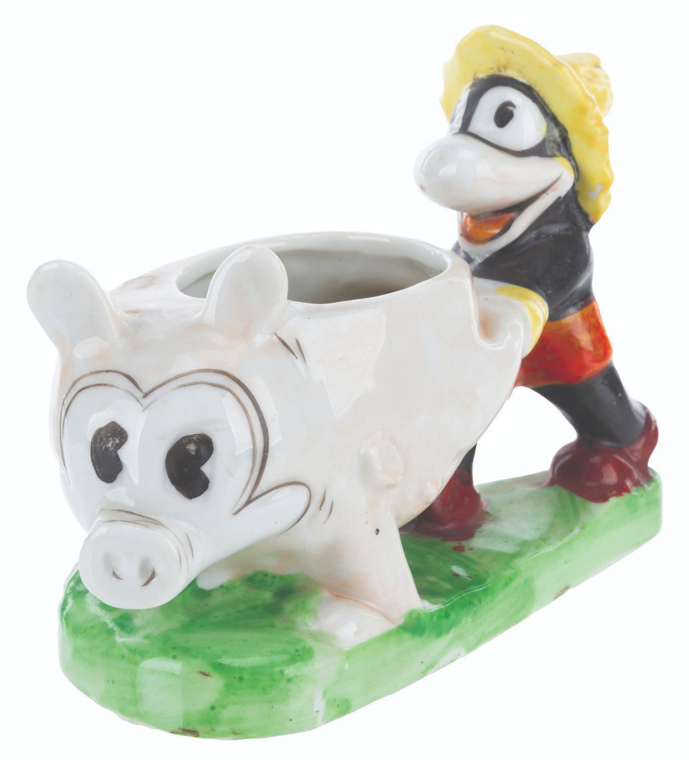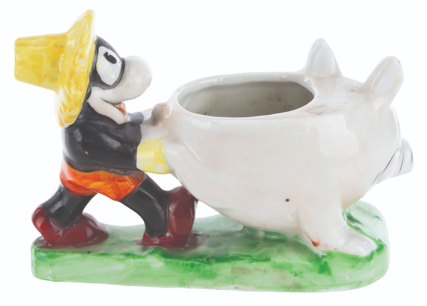 (Japan, 1930s) A Flip the Frog ceramic planter depicting the Iwerks' character using a pig as a partner in a wheelbarrow race. Measuring 6.25” x 3” x 5” tall, the planter is in good condition with paint loss, stains, smudges, scuffs, and wear. Ub Iwerks, the animator chiefly responsible for the design and animation of the first 15 Mickey Mouse shorts, left the Disney Studio in 1930 after a falling out with Walt. Ub set up Iwerks Studio to produce a series of cartoons with all new characters, most famously, Flip the Frog. Flip starred in only 15 cartoons over a period of three years before being dropped by distributor MGM. Unlike his contemporary rival, Mickey Mouse, merchandise featuring the character is incredibly rare, particularly pieces in good condition such as the ones offered here.