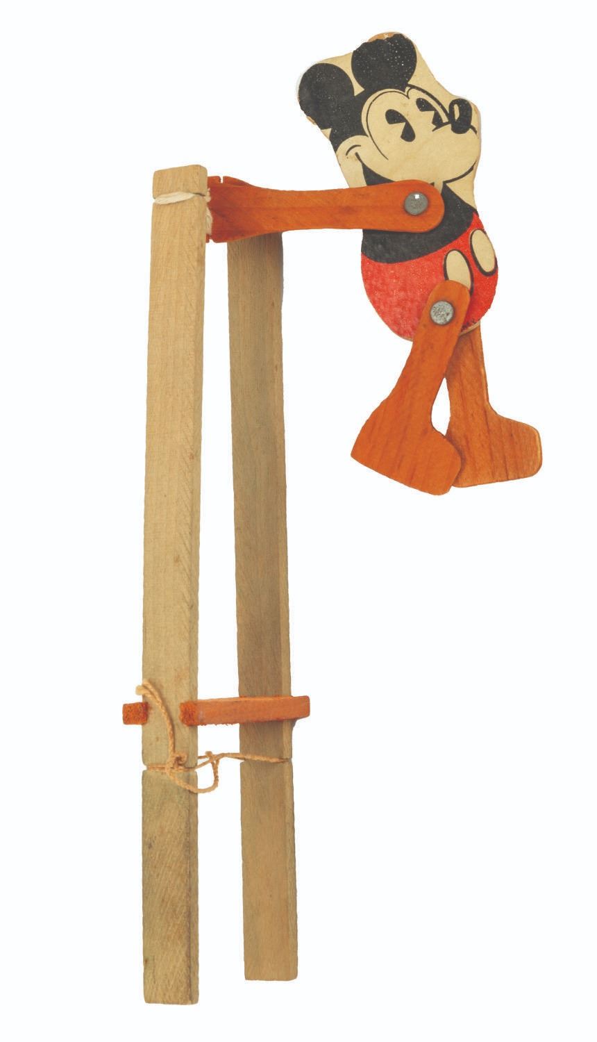 (Milton Bradley, 1930s) A Flippy Mickey toy by the Milton Bradley Company of USA. The wooden Mickey toy performs somersaults and flips. Measuring 8.5” tall, the toy is in good condition with light material loss and wear.