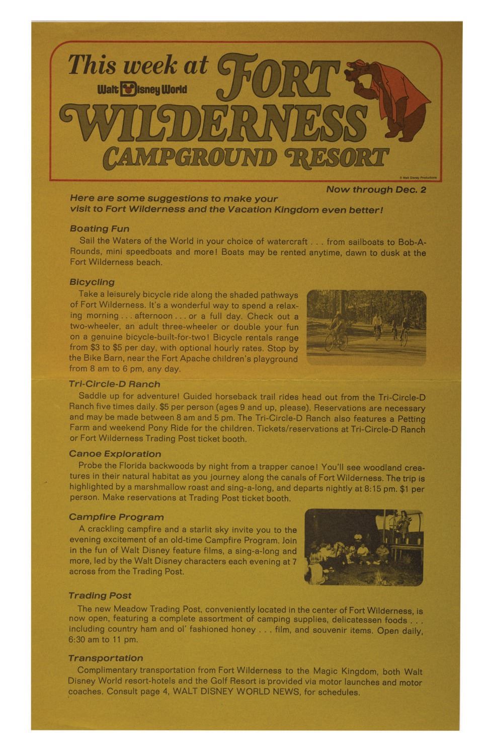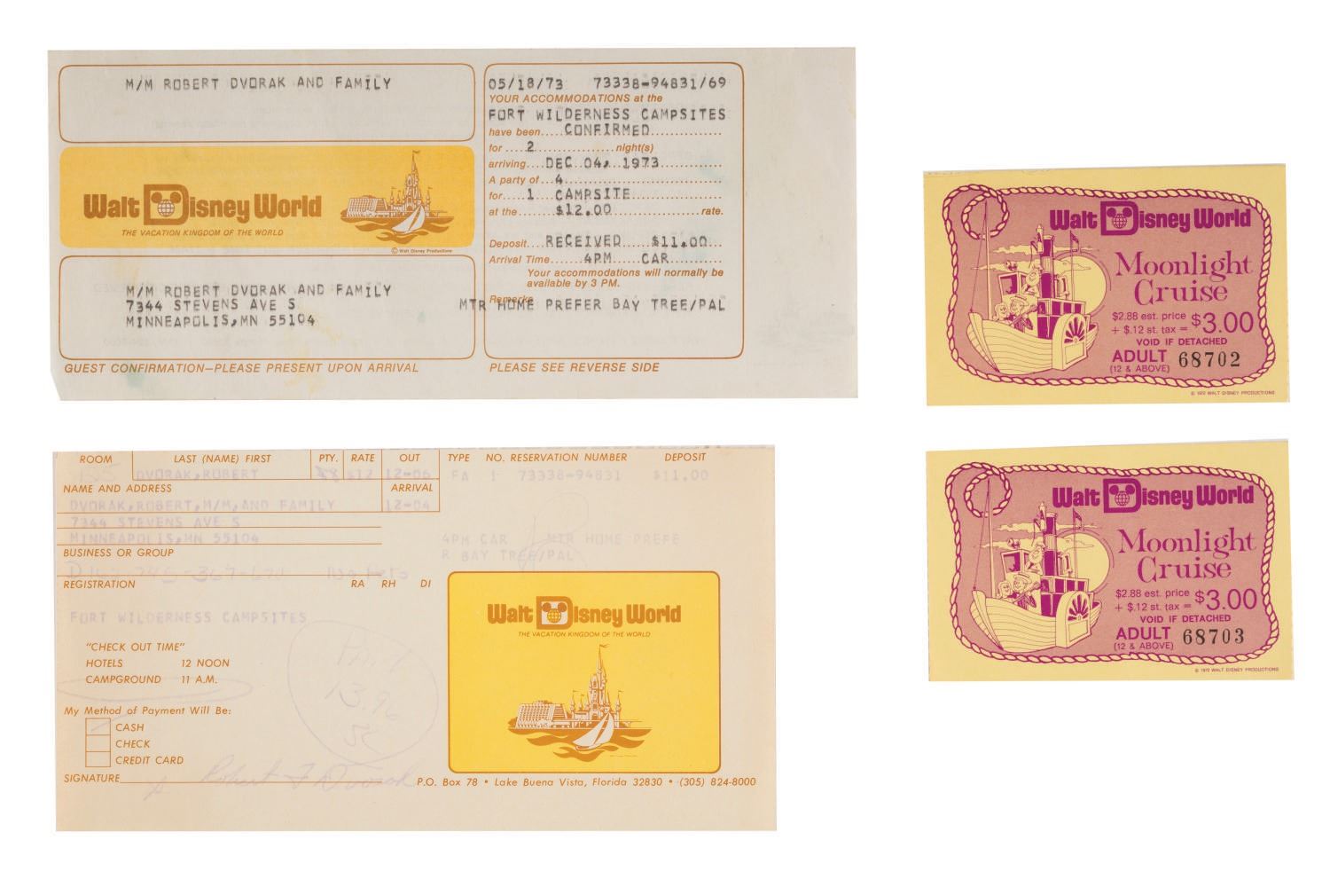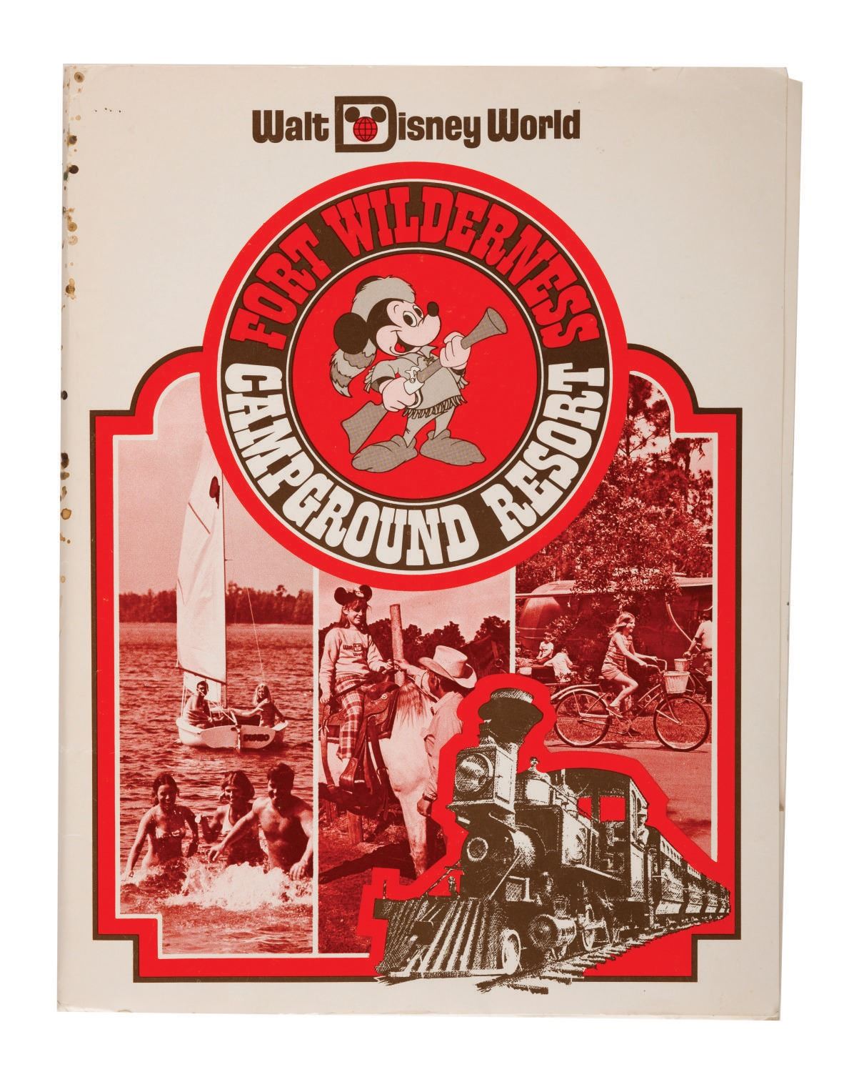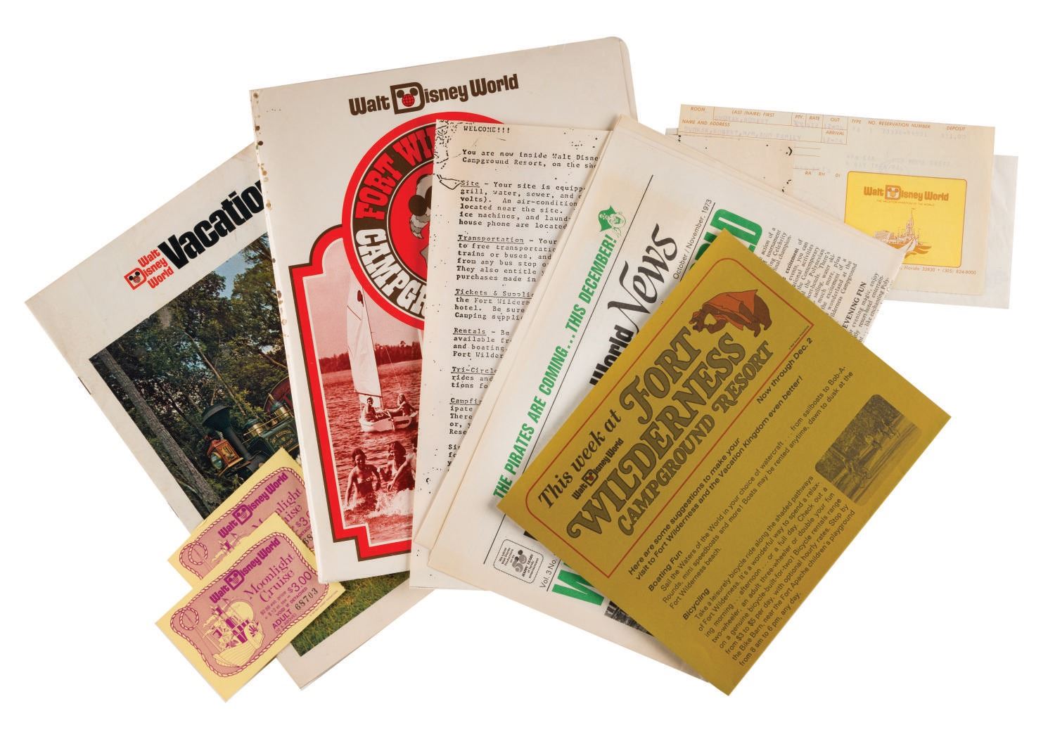 (Fort Wilderness, 1973) An original Fort Wilderness Campground Resort Guest Services folder. This resort folder was issued to Guests upon check in and features vintage receipts, Moonlight Cruise tickets, copies of This Week at Fort Wilderness, Walt Disney World News, and Vacationland magazines. Measuring 9"x11", the folder with contents is in good condition with some spots of discoloration and wear from handling and age.