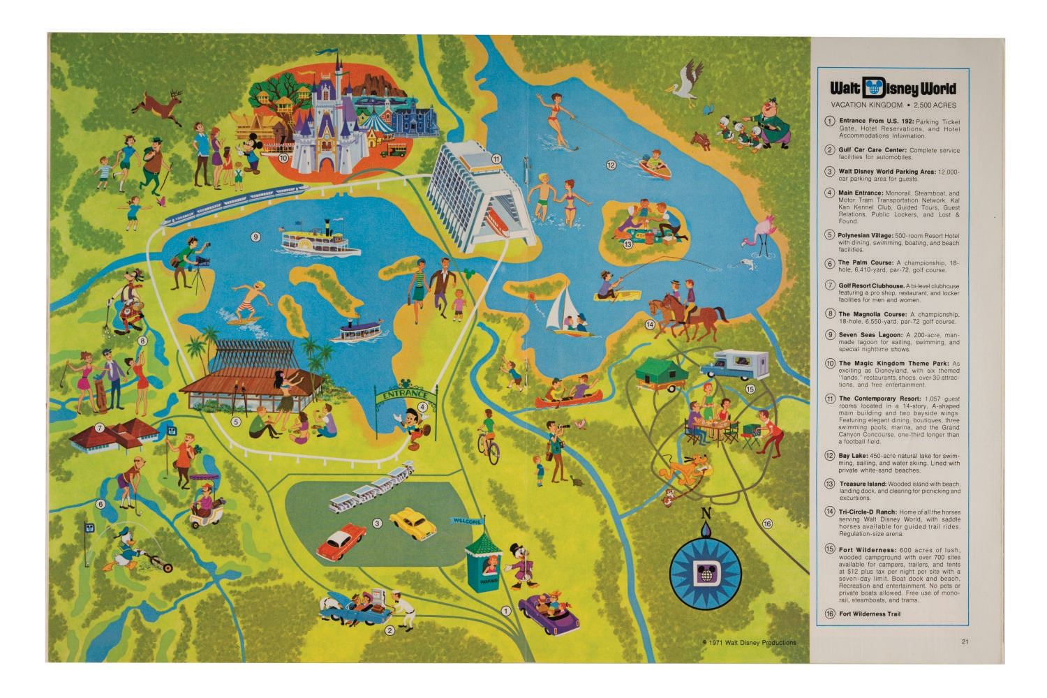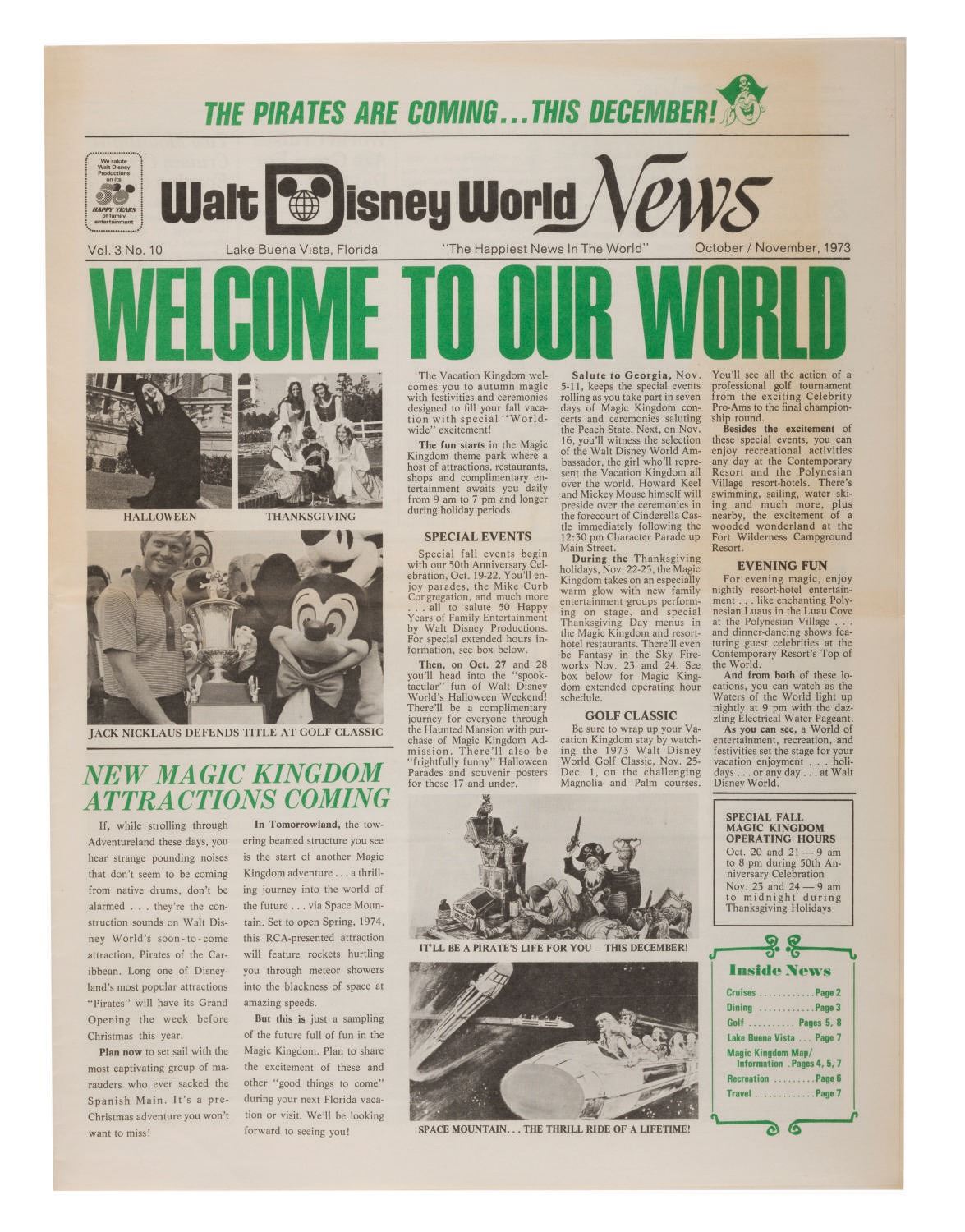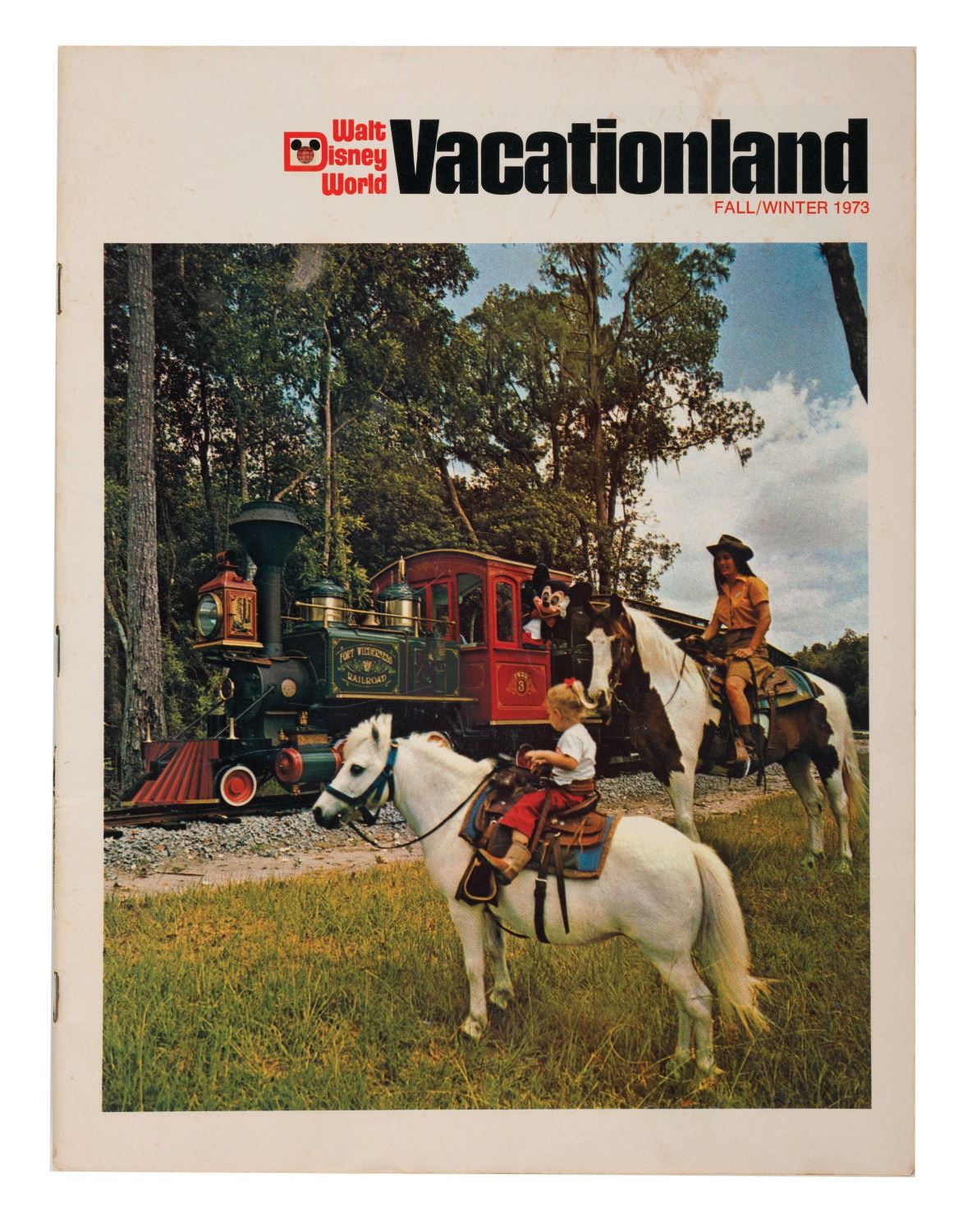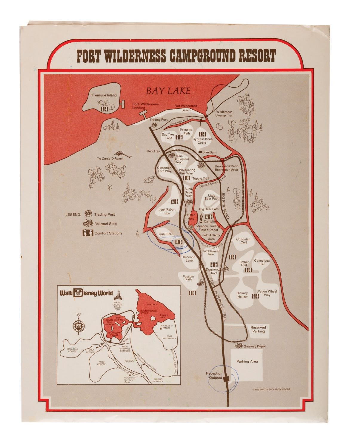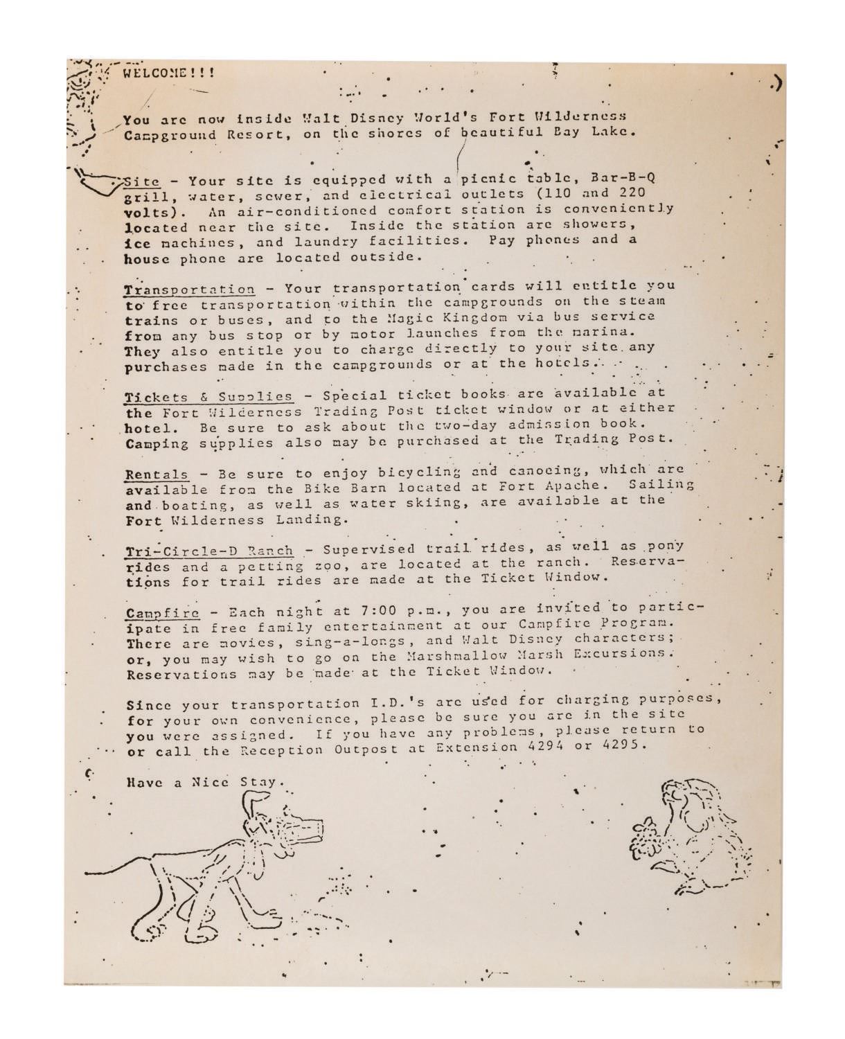 (Fort Wilderness, 1973) An original Fort Wilderness Campground Resort Guest Services folder. This resort folder was issued to Guests upon check in and features vintage receipts, Moonlight Cruise tickets, copies of This Week at Fort Wilderness, Walt Disney World News, and Vacationland magazines. Measuring 9"x11", the folder with contents is in good condition with some spots of discoloration and wear from handling and age.