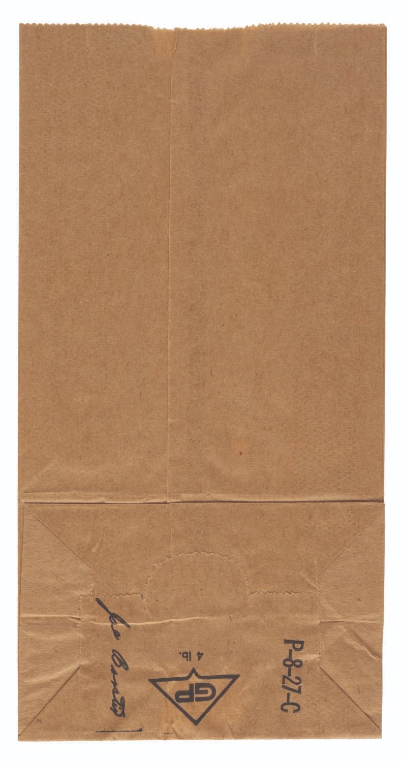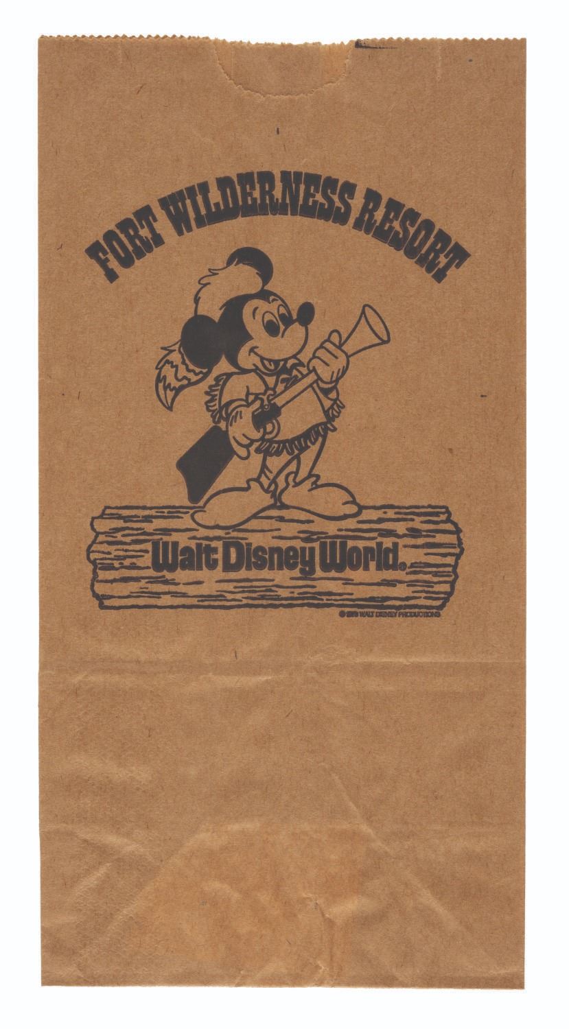 (Disney’s Fort Wilderness Resort, 1980) A paper bag featuring Frontier Mickey from a souvenir shop at Disney's Fort Wilderness Resort. Included is a receipt for a soda and a souvenir, purchased in December 1980. Measuring 5" x 9.5", the bag is in good condition with creases, wear, and a 0.5" tear at the top.