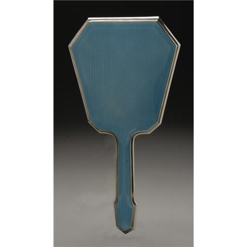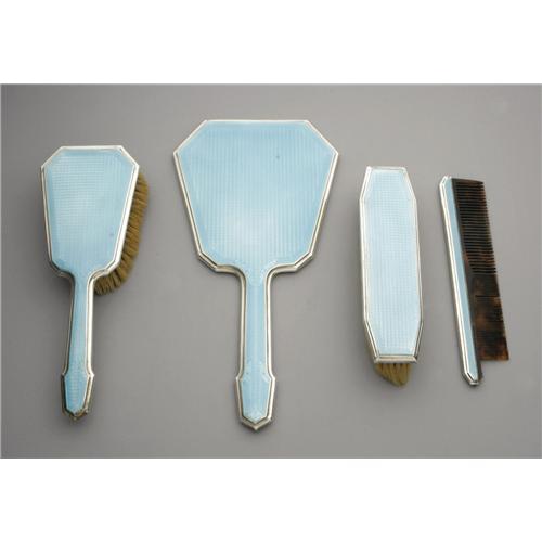 <B>An American Silver And Enamel Vanity Set</B></I><BR><B>Foster & Bailey, Providence, RI, Early Twentieth Century</B></I><BR><BR>Comprising a hand mirror, hair brush, clothes brush and comb, hallmark to the front with <I>STERLING</B></I><BR>The mirror: 11.5in. long x 6in. wide4 Items <BR><BR><B>Condition Report:</B> Normal signs of wear as appropriate with age; the comb is missing teeth.