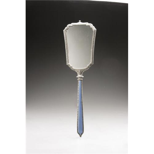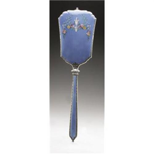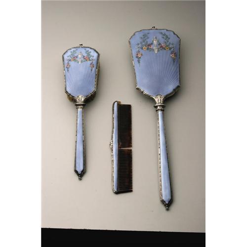 <B>An American Silver and Enamel Vanity Set</B></I><BR><B>Foster & Bailey, Providence, RI, Late Nineteenth Century</B></I><BR><BR>Including a hand mirror, hair brush and comb, hallmark to the top of the handle with <I>STERLING</B></I><BR>15.6in. long x 4.3in. wide3 Items <BR><BR><B>Condition Report:</B> Normal signs of wear as appropriate with age; the comb is missing teeth.