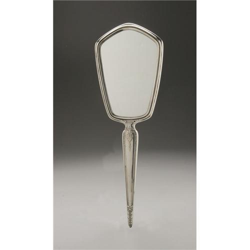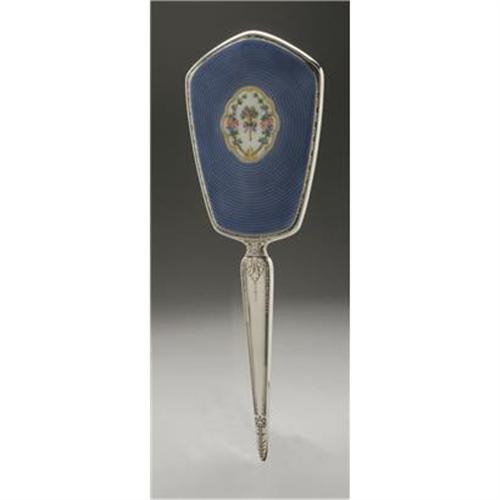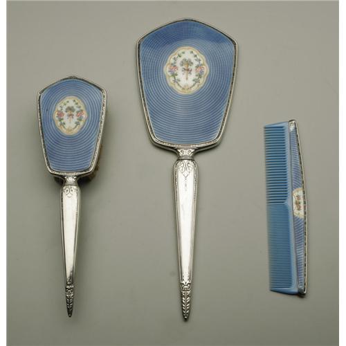 <B>An American Silver And Enamel Vanity Set</B></I><BR><B>Foster & Bailey, Providence, RI, 1925</B></I><BR><BR>Comprising a hand mirror, hair brush and comb, hallmark to the front with <I>STERLING PAT. JUN-30-'25</B></I><BR>The mirror: 14in. long x 4.6in. wide