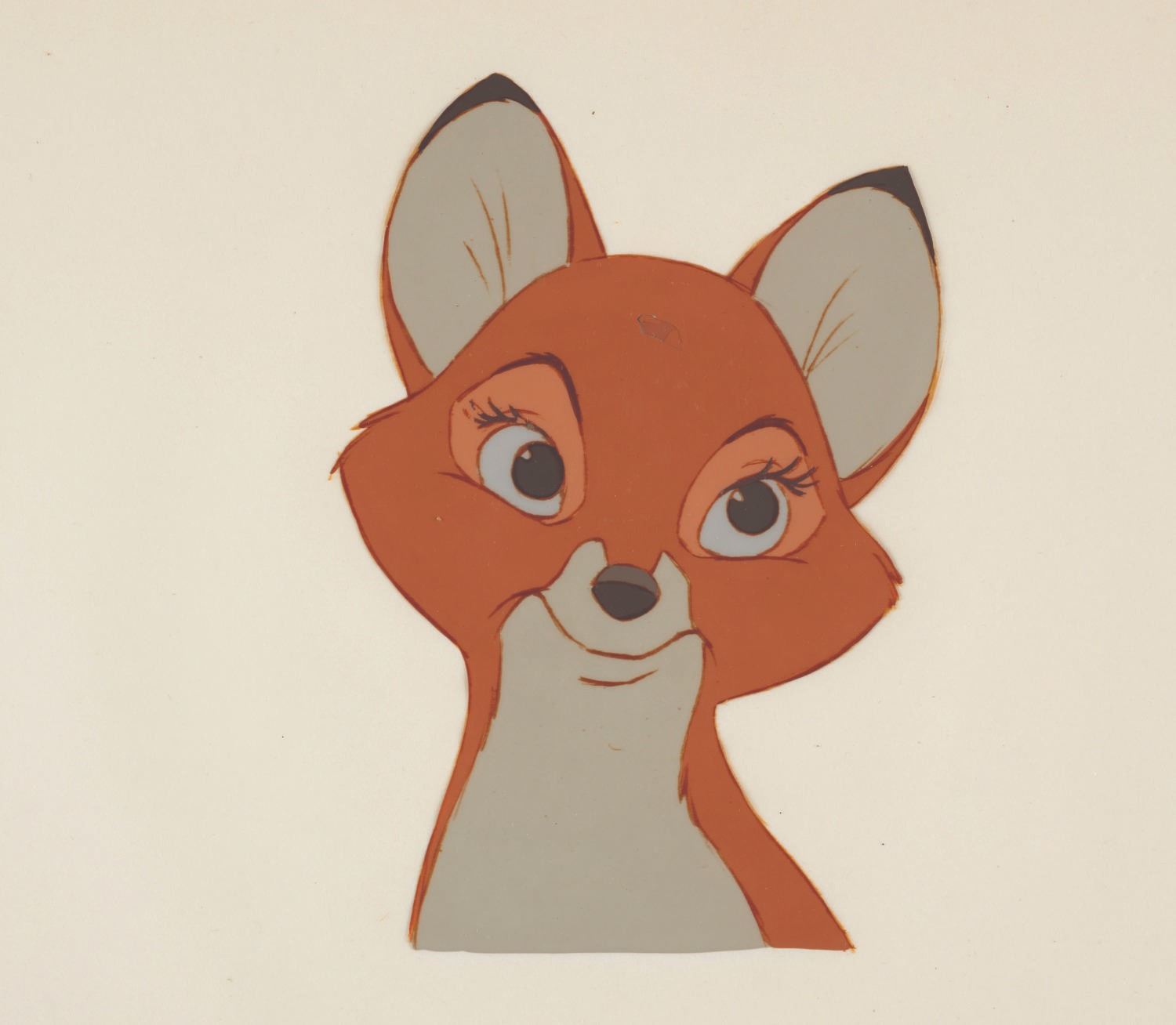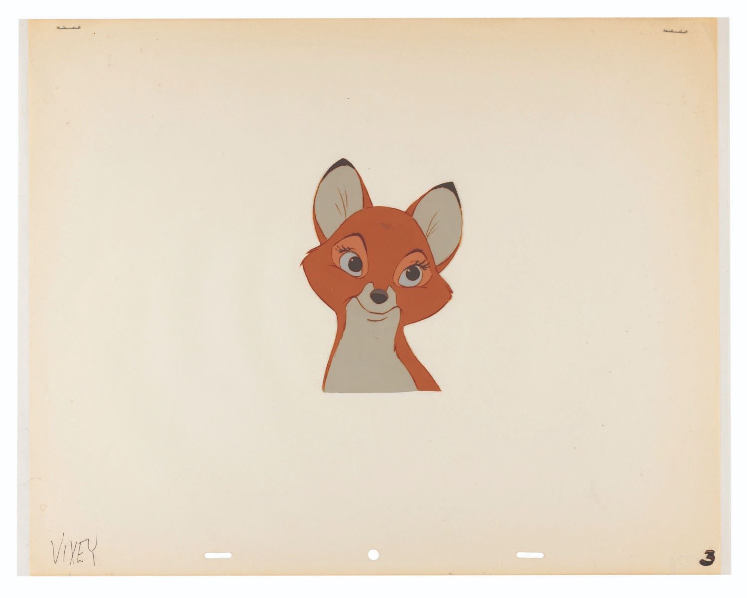 (Disney, 1981) An original production cel of Vixey from "The Fox and the Hound.” Vixey has an image size of 3.5” x 5.25” on a 12.5” x 16” cel. The cel is in good condition with scratches, paint cracks to the forehead, and stapled to 12” x 16” animation paper with discoloration from age.