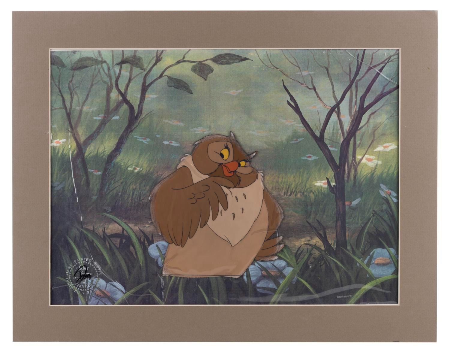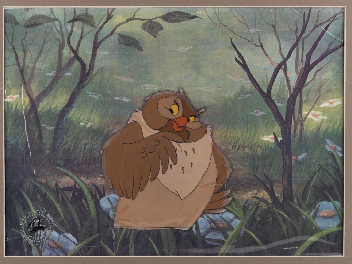 (Disney, 1981) An original production cel of Big Mama from"The Fox and the Hound." Big Mama has an image size of 5.75" x 6" on the 12.5" x 15.75" cel. The piece is in fair to good condition, with paint lifting and wear from lamination around most edges of the character.