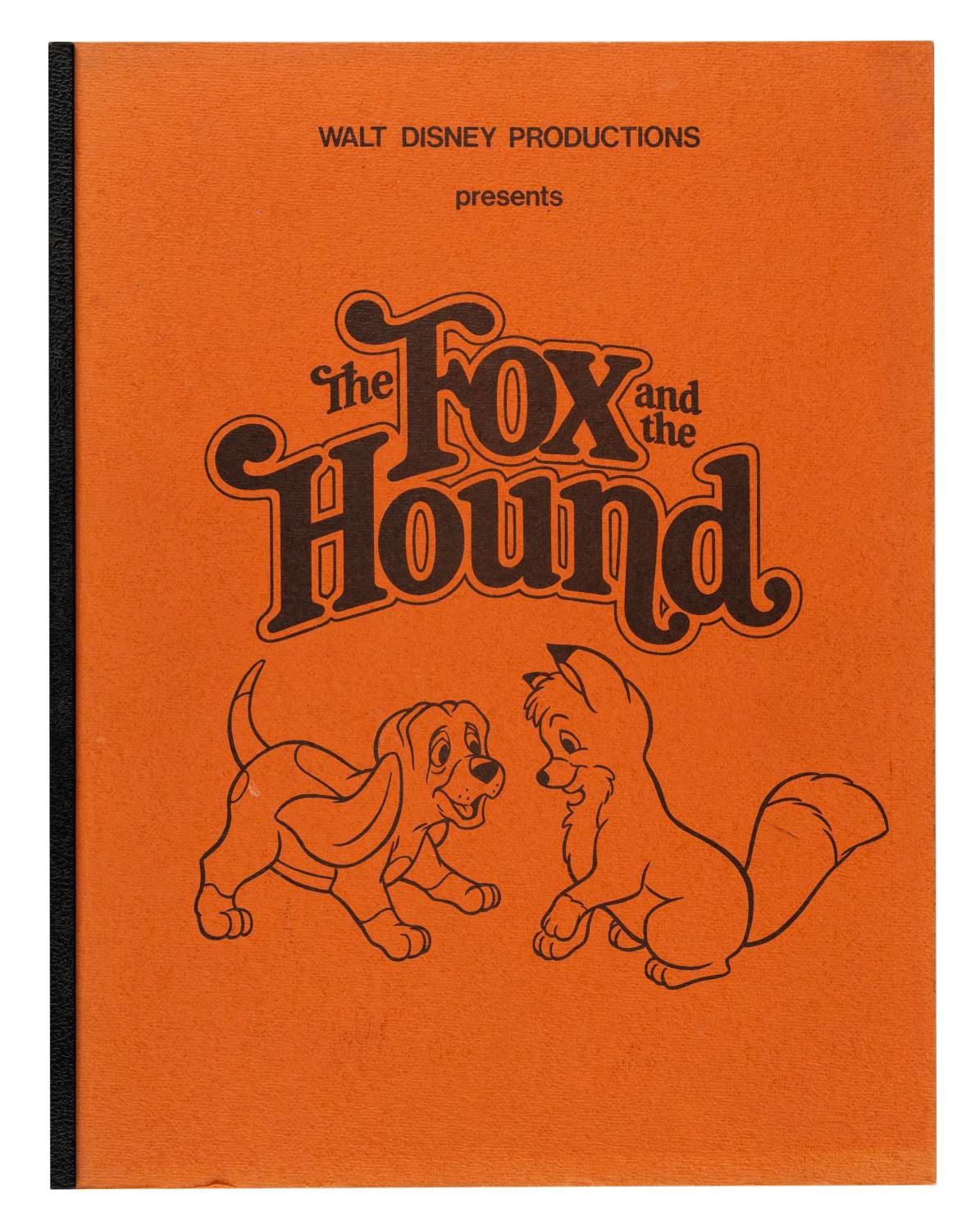 (Disney, 1981) A Walt Disney Productions full story copyright establishment book for "The Fox and the Hound." The 34-page book tells the story of the film, accompanied by black-and-white photos and character line art. Measuring 8.5" x 11", the book is in very good condition with light edge wear, scuffs on the cover, and discoloration from age.