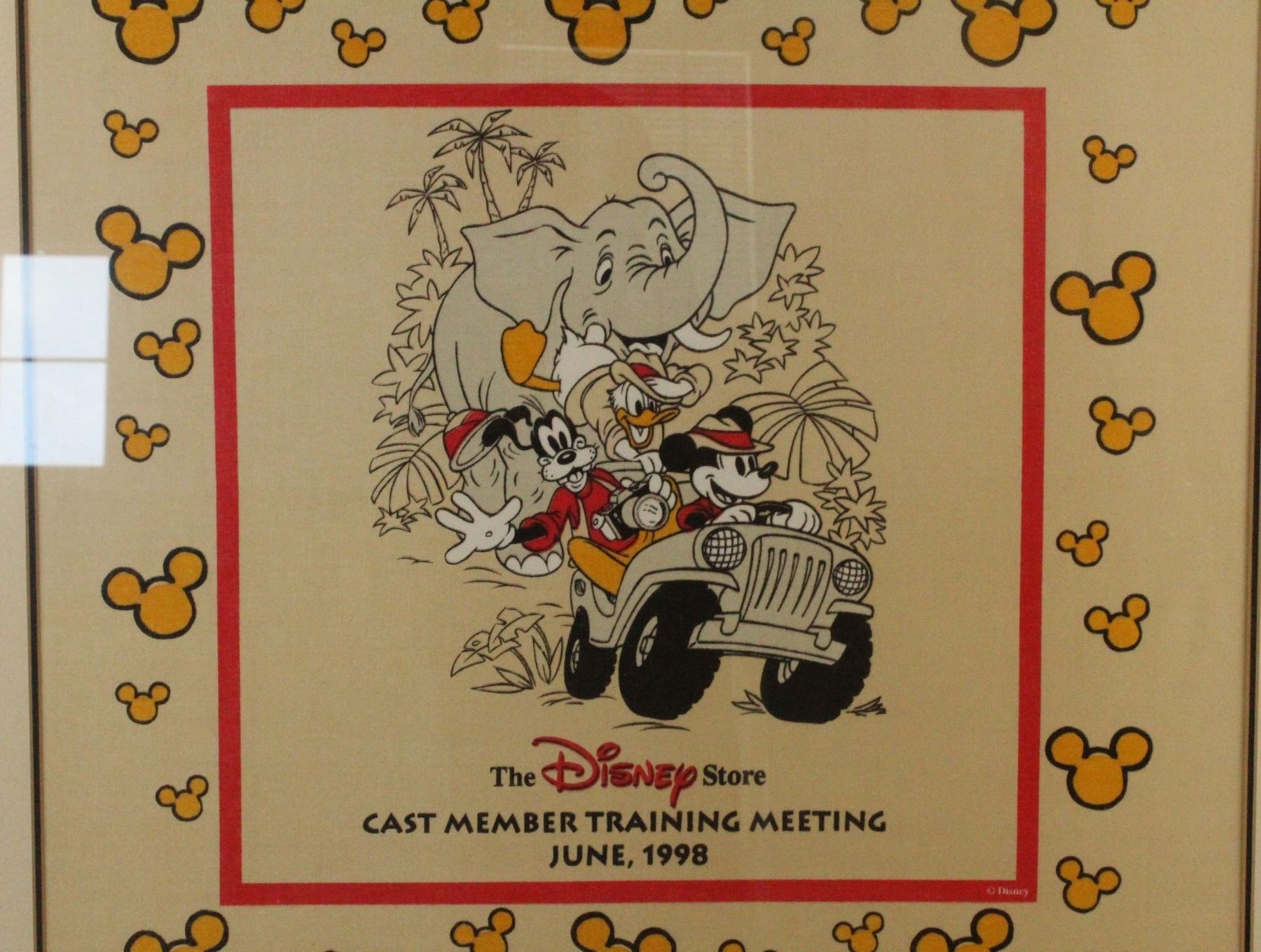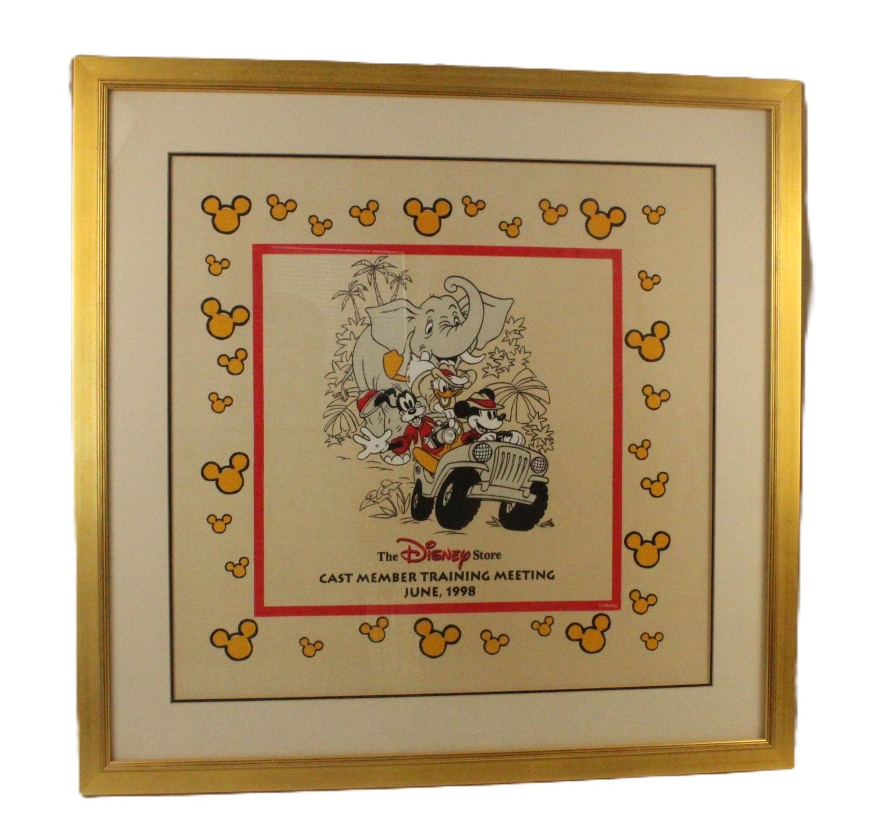 (Disney Store, 1998) This is a Cast Member Training Meeting event gift from June 1998. It is a handkerchief that features Mickey, Donald and Goofy on safari being chased by an elephant. It is in excellent condition. The frame measures ~27.5” x 27.5”.