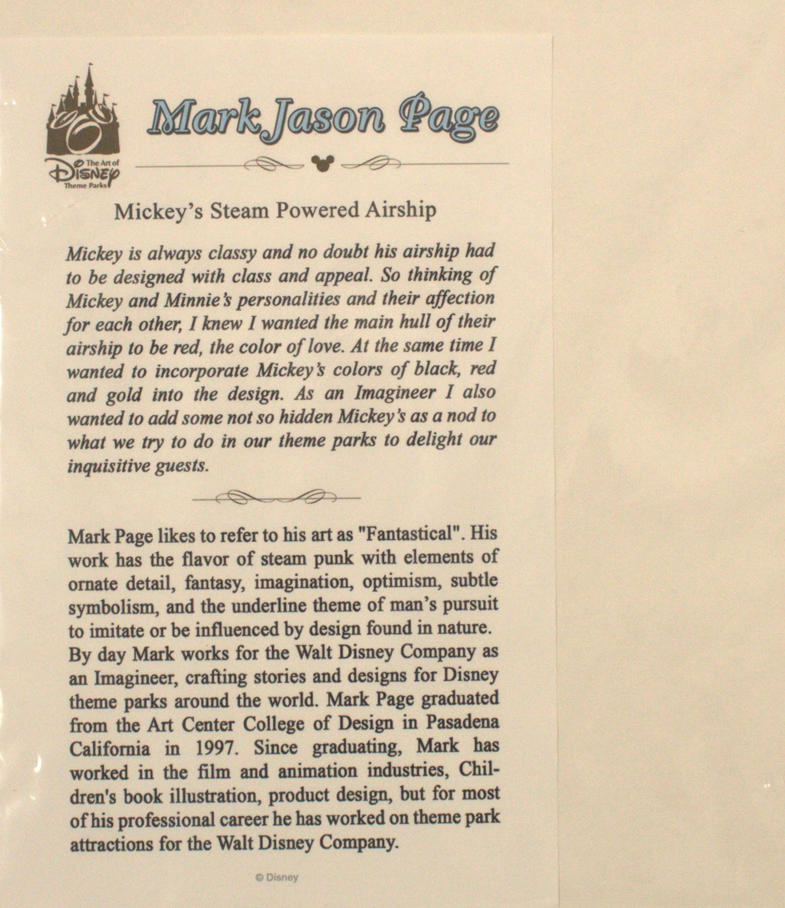 This beautifully matted and framed print by Mark Jason Page is titled "Mickey's Steampowered Airship". Drawn in a classy steam punk style, the artists captures both elegance and sophistication and includes some not so hidden mickeys for fun. The artist signature is in the bottom right corner. It is double matted and measures ~21" X 17".