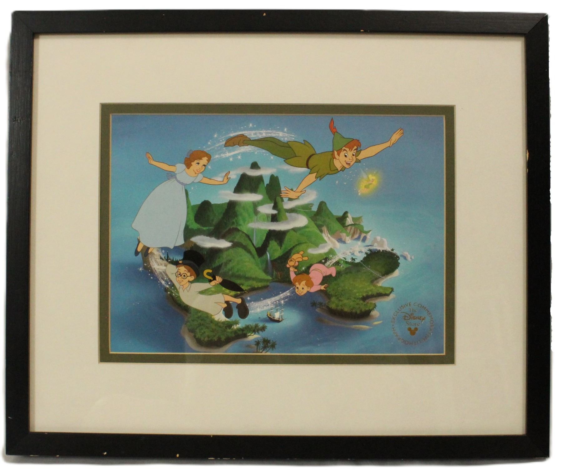 This Disney Store Exclusive lithograph features Peter Pan, Wendy, Michael, and John flying in front of Big Ben. This lithograph is framed and matted and measures 17" x 14".