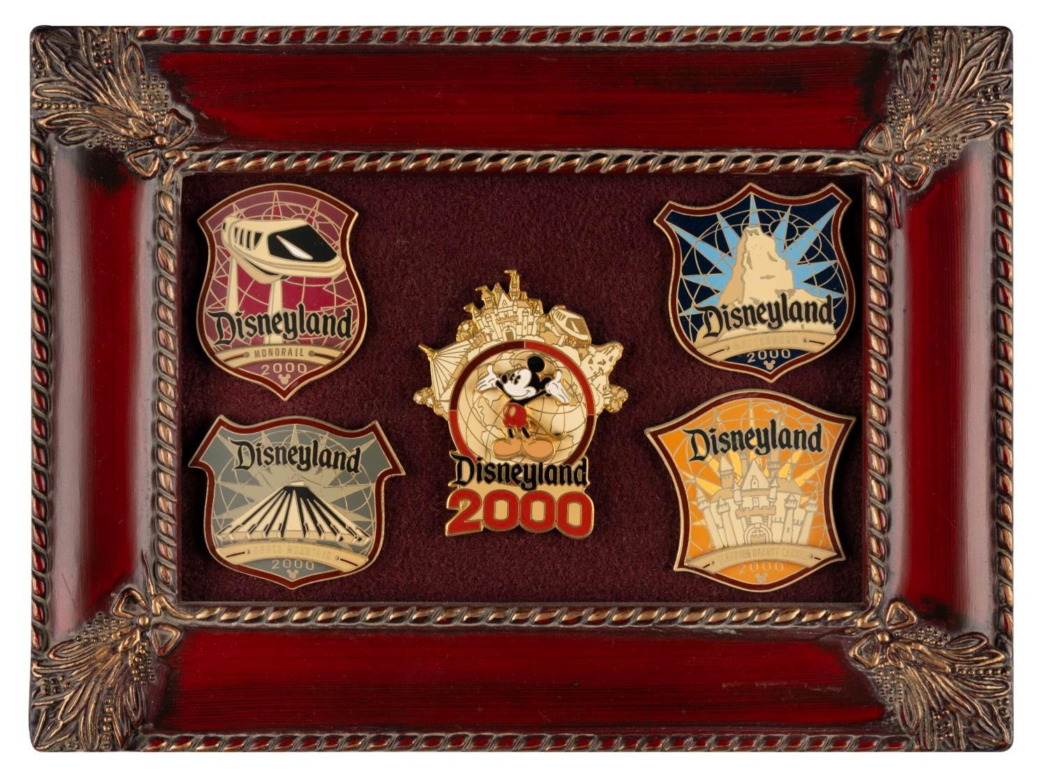 (Disneyland, 2000) A custom-framed collection of five pins from the 45th anniversary of Disneyland. Included are pins featuring the Monorail, the Matterhorn, Sleeping Beauty Castle, Space Mountain, and Mickey Mouse. Measuring 5.25" x 7.25" overall, the framed collection displays in very good condition.