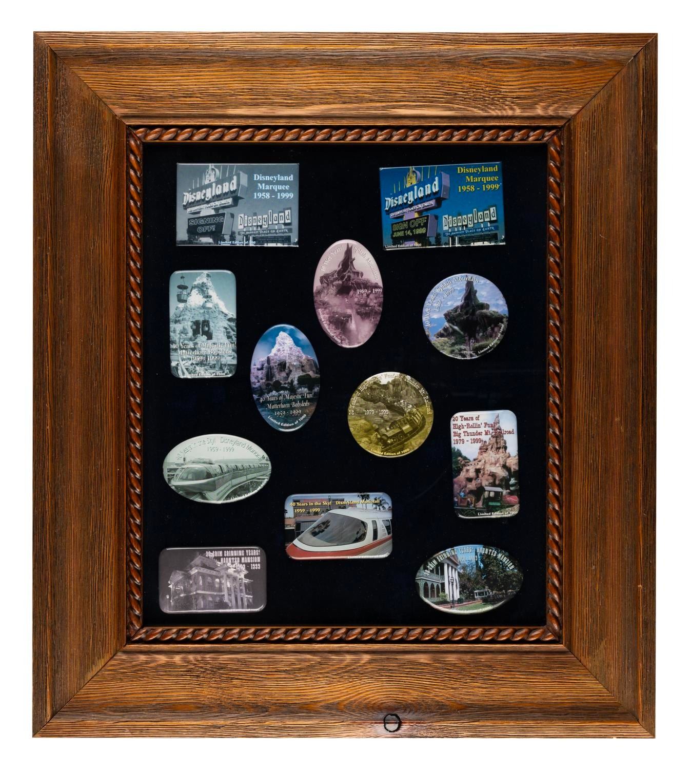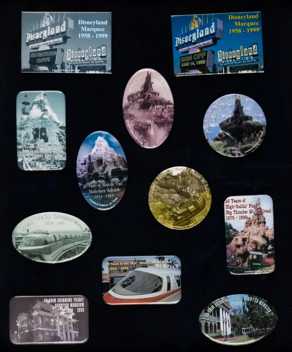 (Disneyland, 1999) A framed set of limited edition Disneyland buttons. These buttons from 1999 celebrate the anniversaries of many attractions including The Haunted Mansion, Big Thunder Mountain Railroad, Splash Mountain, the Matterhorn, and the Monorail, as well as the final year of the Disneyland marquee. Ranging in size from 2.25” in diameter to 2.25” x 3.25” in a 10.25” x 12.25” window of a 15.5” x 17.5” wooden frame, the buttons are in good to very good condition with light scratches and wear, while the frame exhibits light scratches and is covered with tape on the reverse.