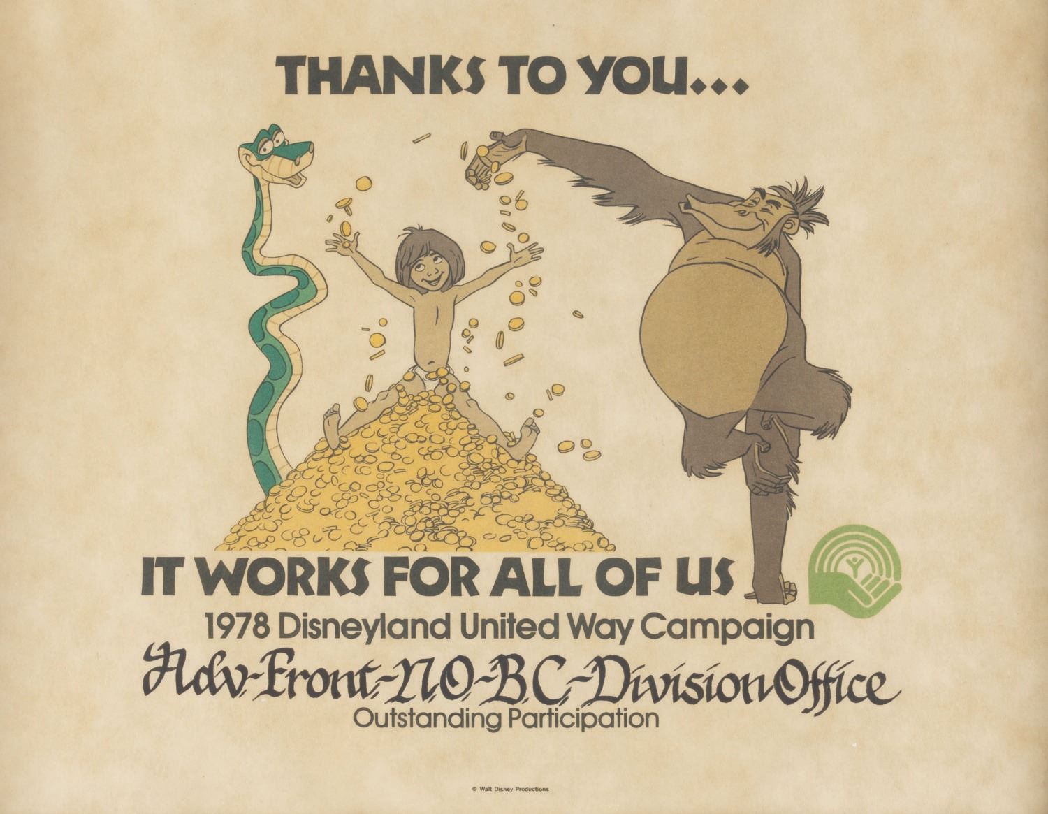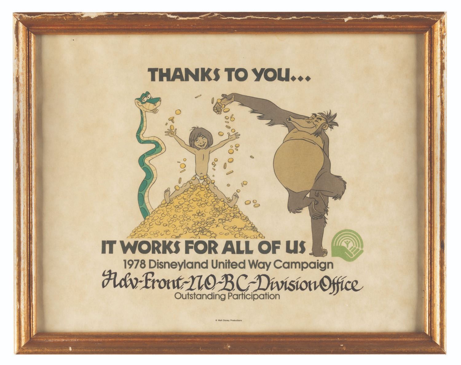 (United Way, 1978) A certificate of participation for the 1978 Disneyland United Way Campaign. The certificate features characters from "The Jungle Book" and a handwritten acknowledgement of the participating office. Measuring 9.5" x 12" in the frame, the certificate is in good condition with fading and discoloration, while the gold-accented frame has spots of loss.
