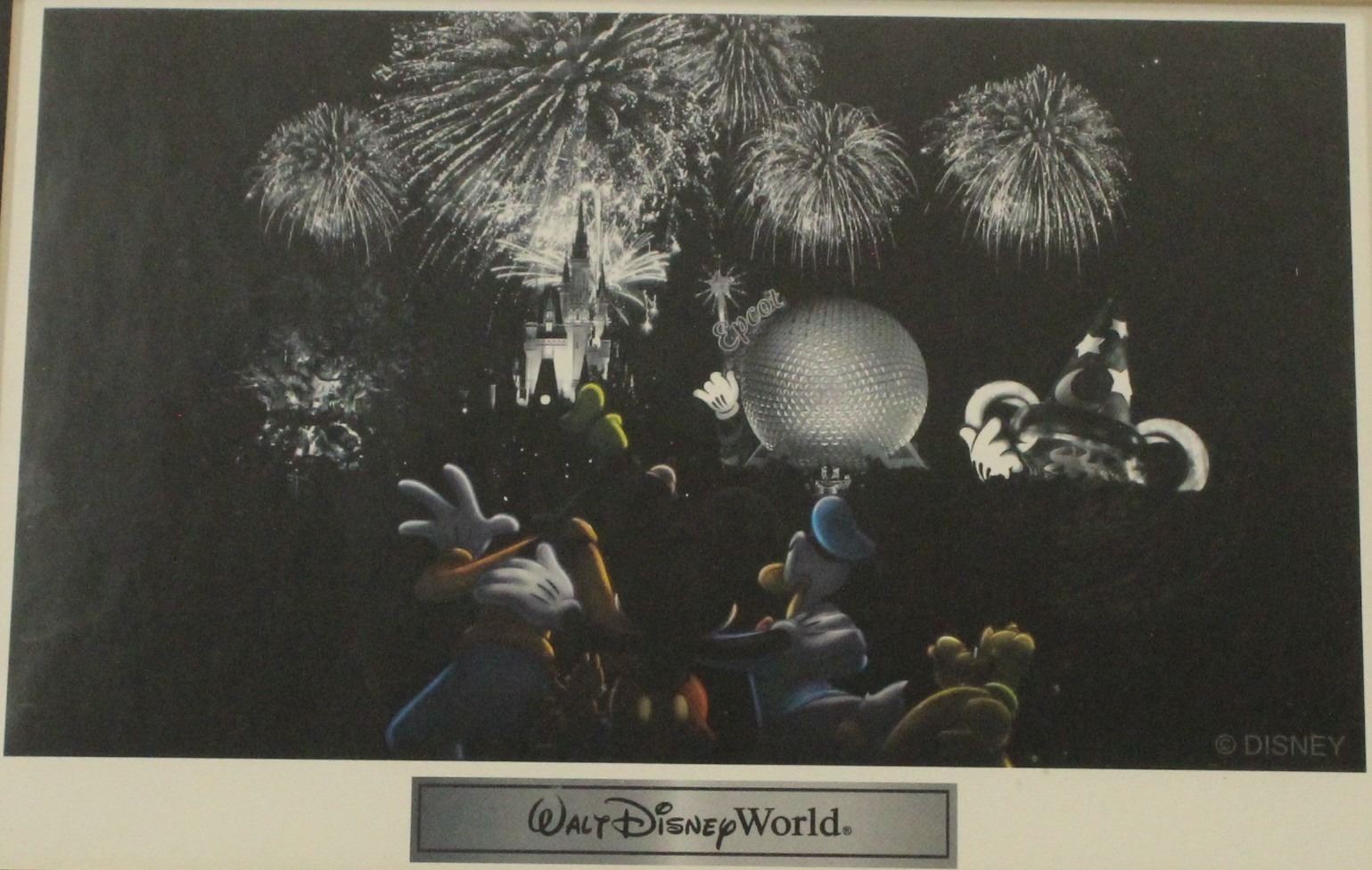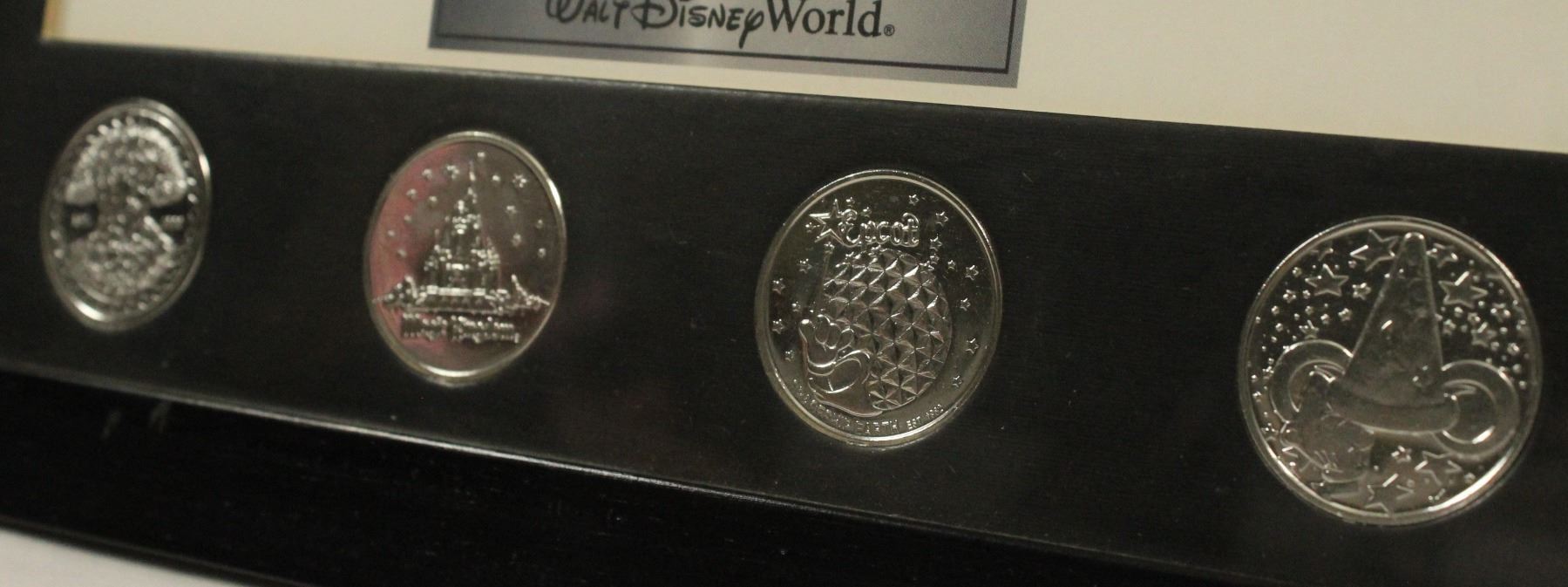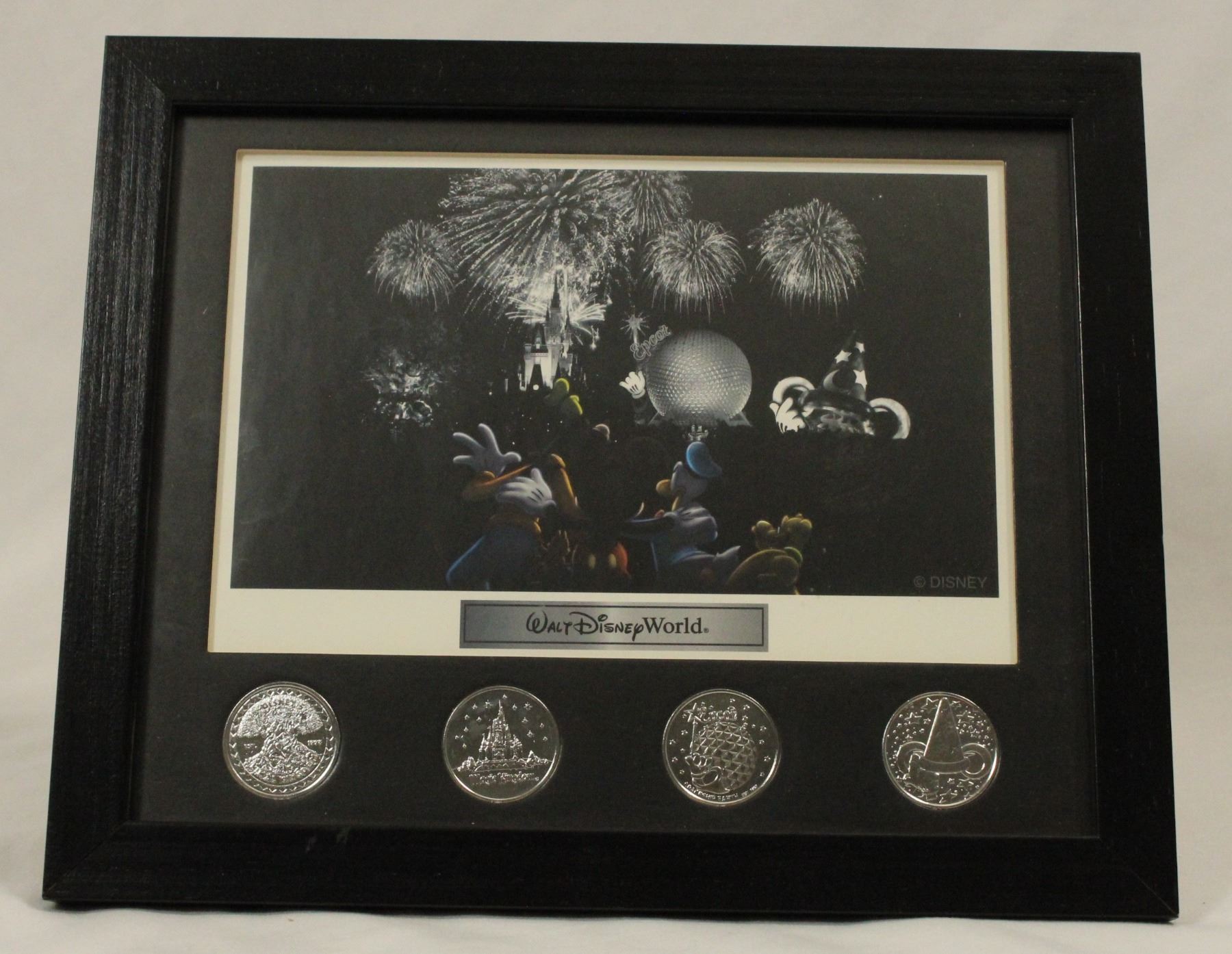 (Walt Disney World) This lithogrph features Goofy, Mickey, Donald, and Pluto gazing off at the icons of the four Walt Disney WOrld Resort parks. Below the lithograph is a silver colored coin, one for each of the theme parks.