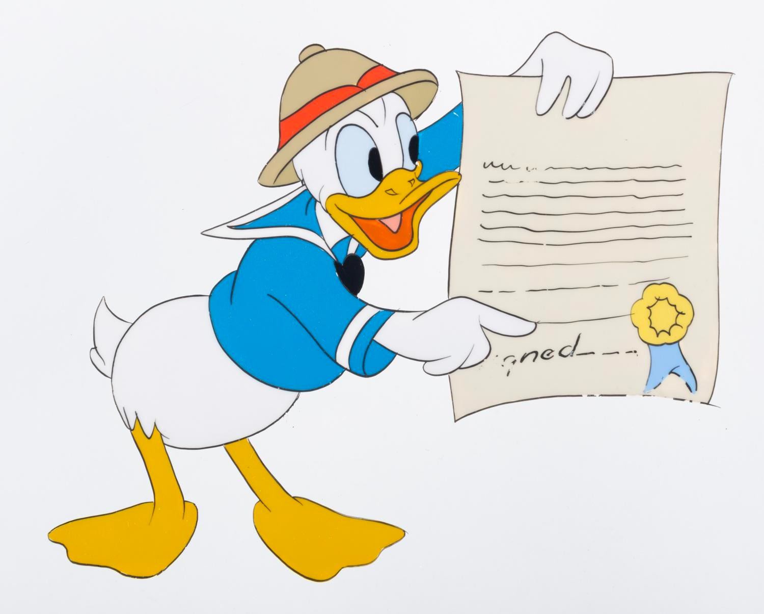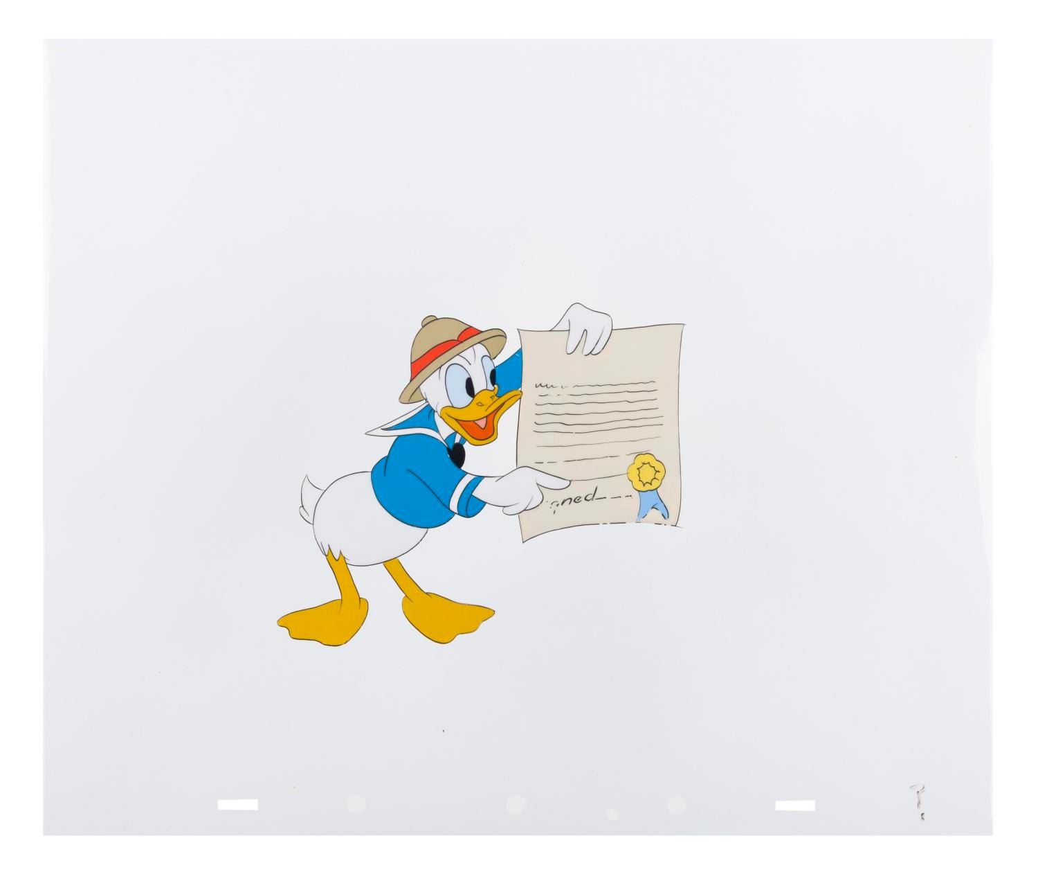 (Disney, 1946) A hand-painted original production cel of Donald Duck from “Frank Duck Brings ’Em Back Alive.” The Donald & Goofy series short was a play on hunter/author Frank Buck’s bestseller Bring ’Em Back Alive. With a character image size of 4.5” x 5.25” on a 10” x 12” cel, the art is in good condition with spots of paint loss, scratches, and stains.