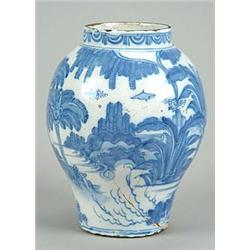 A Frankfurt fayence blue and white baluster vase, typically painted in the Transitional style wit...