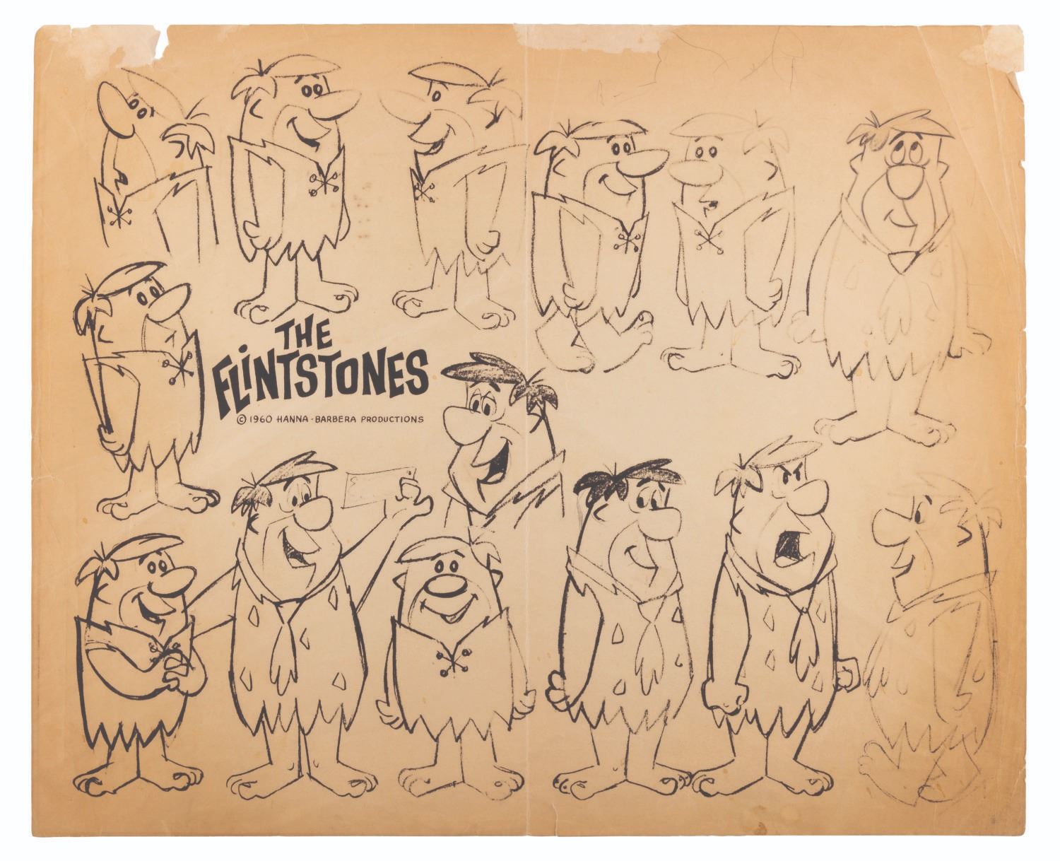 (Hanna-Barbera, 1960) An original production used photostat model sheet of Fred and Barney from the first season of “The Flintstones.” Model sheets such as these were distributed to animators and crew working on the series to ensure character design continuity. Measuring 14” x 17”, the model sheet is in good production used condition with a vertical fold running the length of the center, color shift from age, edge wear, and a small 0.5” rip in the upper left which does not affect the image.