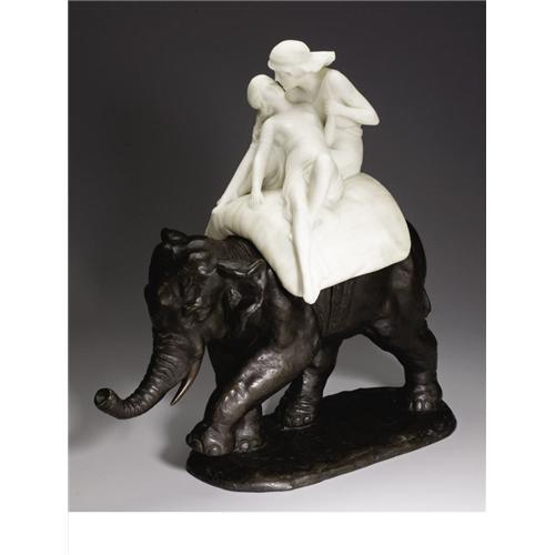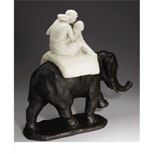 <B>A French Bronze And Marble Orientalist Figural Group</B></I><BR><BR>Artist Unknown, French<BR>Nineteenth Century<BR>Bronze and white marble<BR>18 in. x 18.5 in.<BR><BR>Depicting a Sheik and his consort in an amorous embrace on a sumptuous blanket, all carved in white marble, seated atop an elephant cast in bronze