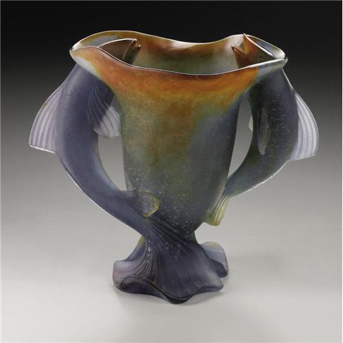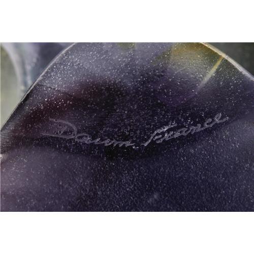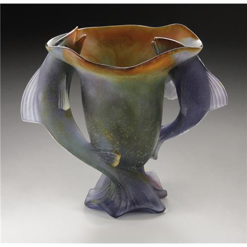 <B>A French Glass Vase</B></I><BR><B>Daum Nancy, Twentieth Century</B></I><BR><BR>The purple to burnt sienna pate-de-verre vase with two fish forming the foot and handles, marked underside <I>Daum France</B></I><BR>9.6in. high<BR>Provenance: From the collection of Rita and Richard Chouinard.