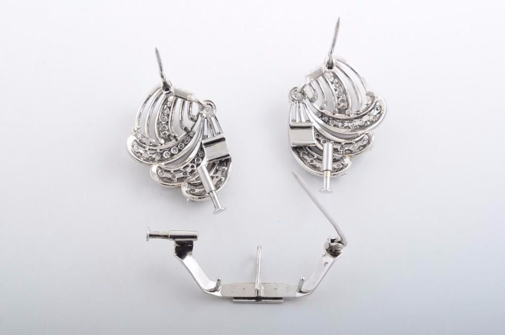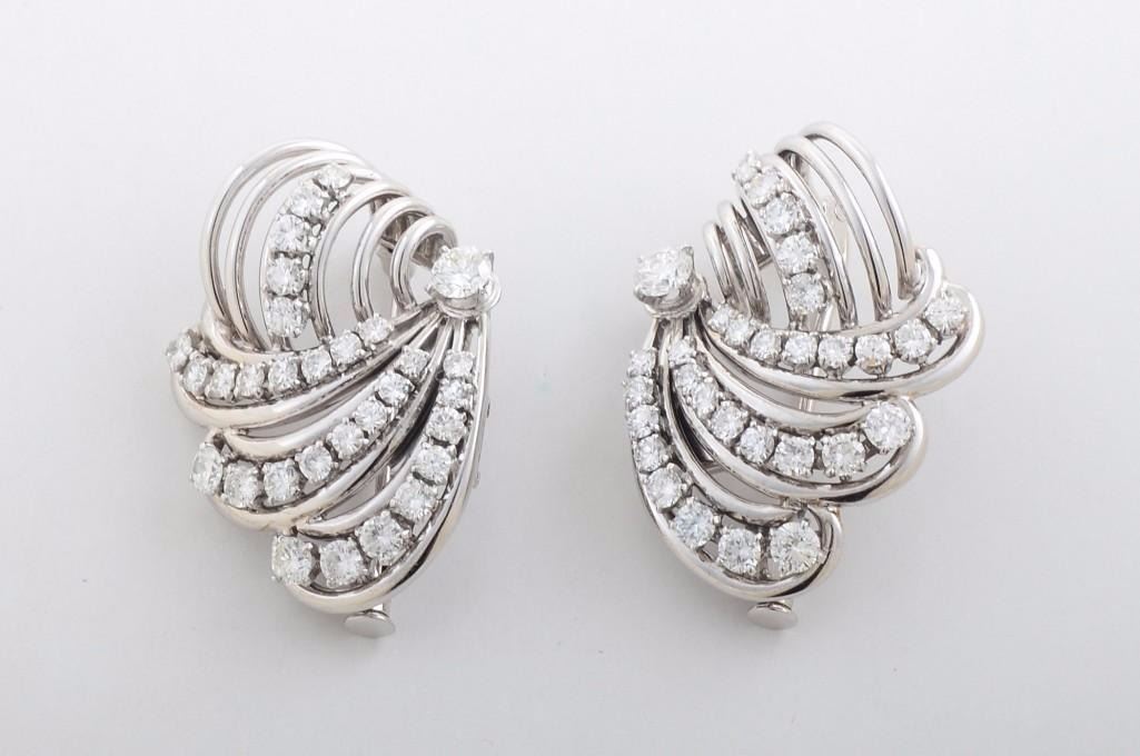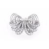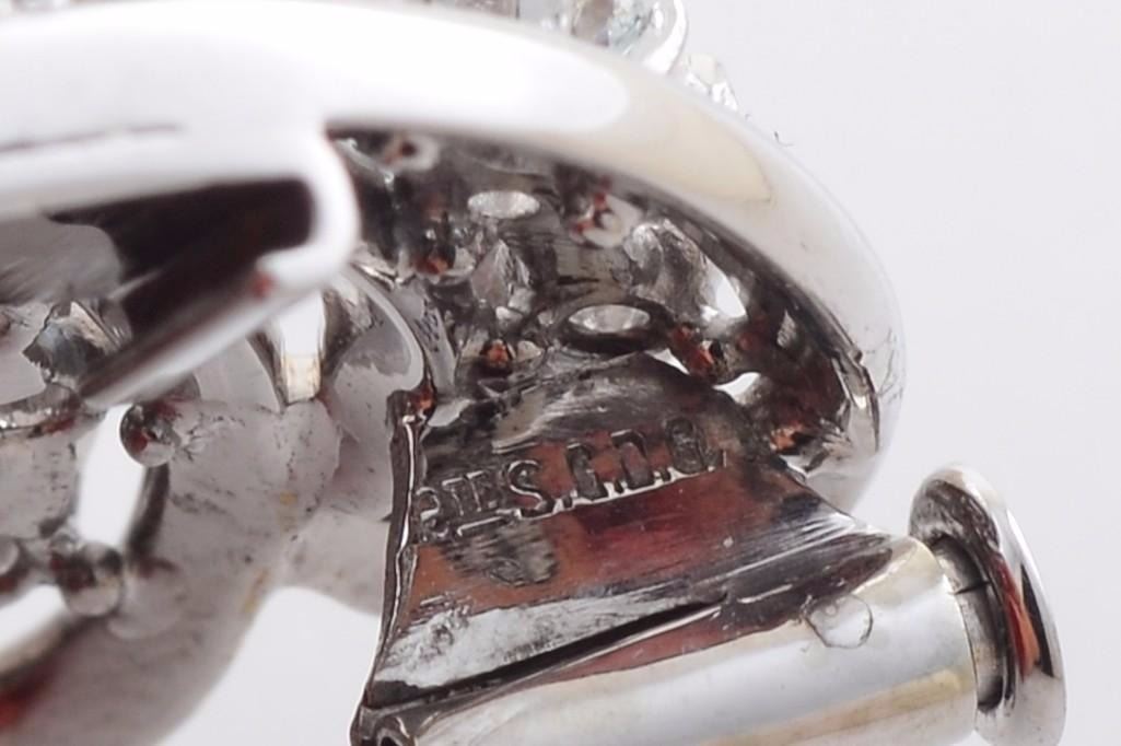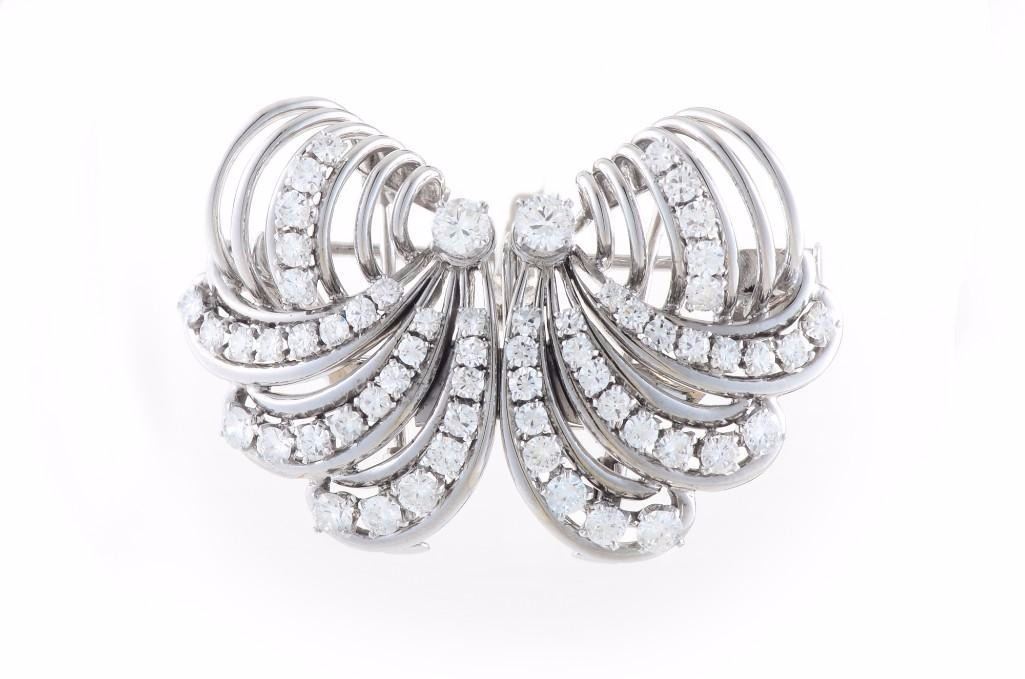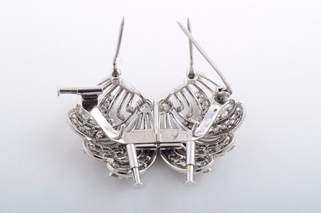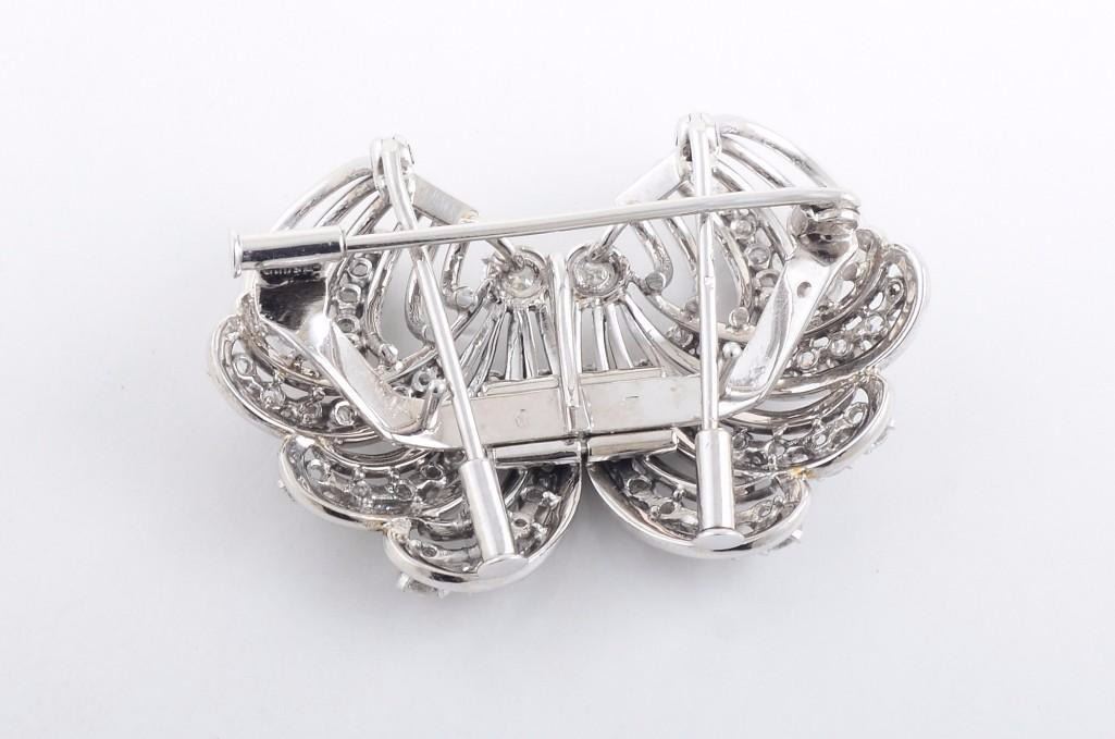 A diamond double clip brooch from 1950s France. Features 60 diamonds weighing approximately 5 carats. Set in 18K white gold stamped with makers marks and hallmarks. Width measures 1 3/4 inches; total weight 21.6g
