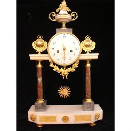 A French Empire ormolu-mounted gilt-bronze marble mantel clock (early 1800).