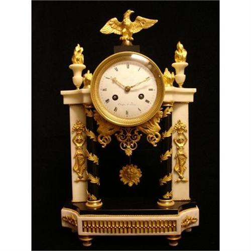 A French Empire ormolu-mounted gilt-bronze marble mantel clock (early 1800).