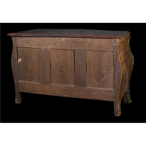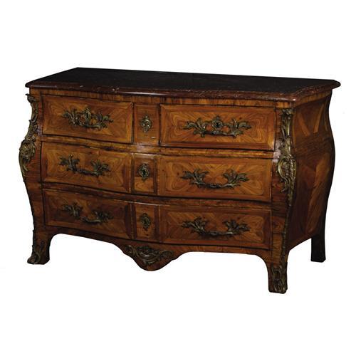 <B>A French Provincial Bombe Form Commode</B></I><BR><BR>Tairraz, French<BR>Circa 1750-1770<BR>Walnut veneer on oak carcass, gilt metal, marble<BR>Signed: <I>TAIRRAZ</B></I><BR>34.75 inches high x 54.75 inches wide x 25.75 inches deep<BR><BR>Of bombe form, with two small drawers over two full length drawers, each with shaped radiating veneer centered within frame, shaped apron with gilt bronze mount; leaf form handles and cartouche escutcheons; the corners with leaf form chute and sabot joined by banded reeding; red marble top. <B>Condition Report:</B> Normal signs of wear as appropriate with age. Mounts and locks replaced. Restoration and replacements to veneer. Cracking to mable.<BR><BR><b>Shipping:</b> Requires 3rd Party Shipping (<a target="_blank" href="http://www.heritageauctions.com/common/shipping.php">view shipping information</a>)
