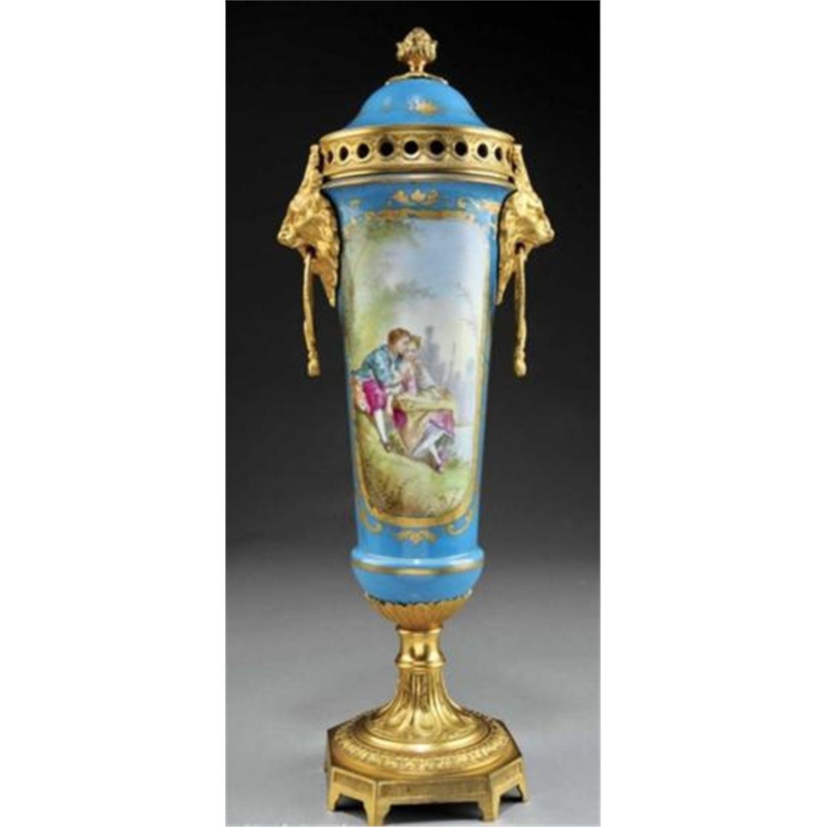 A French Sevres-Style Gilt Bronze-Mounted Lidded Vase, blossom finial, lion's head masque handles, bleu celeste ground, reserves of landscapes and a courting couple, height 17 3/4 in