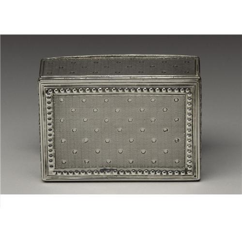 <B>A French Silver Snuff Box</B></I><BR><BR>Unknown maker, Paris, France<BR>Nineteenth Century<BR>Silver and silver gilt<BR>Marks: (boar head)<BR>2.12 in. long, 2.37 troy ounces<BR><BR>Of rectangular form, with top and bottom compartments with all over engraved line and dot pattern, beaded border, laurel wreath border to lid, the top interior with three compartments with hinged covers to two. Silver gilt interior.<BR> <BR><BR><B>Important noti