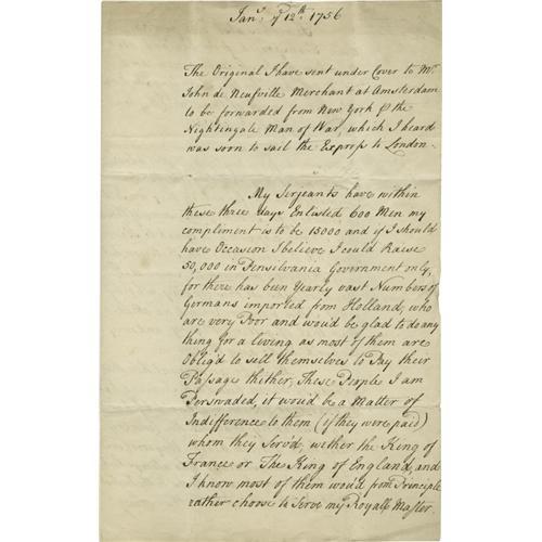 <B>A French Spy's Report on America Intercepted by Britain in 1756</B></I><BR><BR> <B>(French and Indian War) manuscript Letter,</B></I> three pages, 8" x 12.5", [New York], January 12, 1756, a true copy of an intercepted letter addressed to the Duc de Mirepoix in Paris relating developments in North America in the early stages of the French and Indian (or Seven Years) War. This amazing piece of correspondence, from a spy for France who was based in New York, reports primarily upon recent German and "Irish" immigration into British North America and the likelihood they would fight for France. The preface notes that "<I>The Original [intercepted letter] I have sent under Cover to Mr. John de Neufville Merchant at Amsterdam to be forwarded from New York & the Nightingale man of War, which I heard was soon to sail the Express to London.</B></I>" The text of the intercepted letter reads: "<I>My Serjeants [sic] have within these three days Enlisted 600 Men my compliment is to be 15000 and if I should have Occasion I believe I could Raise 50,000 in Pensilvania [sic] Government only, for there has been Yearly vast Numbers of Germans imported from Holland, who are very Poor and wou[l]'d be glad to do any thing for a living as most of them are oblig'd to sell themselves to Pay their Passage thither; These People I am Persuaded, it wou'd be a Matter of Indifference to them (if they were paid) whom they Serv'd; wether [sic] the King of France or The King of England, and I know most of them wou'd from Principle rather choose to serve my Royal [sic] Master. There has also been from time to time, Transported from England, vast Numbers of Irish to Virginia and Philadelphia, for the Peopling The Kings Plantation most of these are of the true Roman Cathoick [sic] Faith. There has also been continually transported form England to the above Places, what they call Convicts, for Crimes committed there, for which they are Sold in Slavery for Seven years, some of these that I have happen'd to Speak to Have Profes[e]'d the true Cathoick Religion, but their Religion is much the same with most of the Hereitcks [sic] in this Country, who (by what I can perceive) mind no other than that of getting Money; and may be hir'd to do any thing. We have an Account here that a Body of Eleven hundred Indians had appear'd at Goshen & behav'd... very insolently that all the Country thereabout were in alarm, they were said to be Delawar[e] Indians, who always had profess'd themselves friends to the English -- But of late seem'd to be Wavering. Goshen is between New York and Albany up Hudsons River (call'd at New York) the North River) back of the Highlands, on the other side the River with New York at 60 miles from New York N.B. We've had the Winter hitherto very Moderate almost every day like Spring & can't hear of any Snow being fallin[g] yet to the Northward.</B></I>" An optimistic report based on vastly incorrect intelligence. The German and "Irish" immigrants to which the spy refers were almost entirely Protestant. The German settlers of Pennsylvania were mostly members of various Protestant sects; and the "Irish" were, in fact, mostly Scots-Irish, mostly Protestants as well. The Scots Irish settled on the Appalachian frontier and were directly threatened by Indian allies of the French. Even those who were Catholic had little reason to side with France as they did not experience a great deal of persecution in most of the American colonies, particularly in Pennsylvania. Even the spy's economic assumptions were flawed by the fact that indentured servants could just as easily escape their obligations by joining the militia to fight for Britain. Accompanied by a set of copies of another intercepted letter from the same correspondent now housed in the British Public Records Office. <I>Provenance,</B></I> Erik Von Scherling, Catalog 53, 1956. Light folds, a few pinholes, else Fine. Interesting, revelatory history articulating "might have been" assumptions. From the Henry E. Luhrs Collection.
