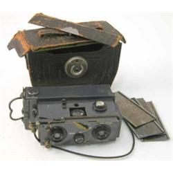 A French Verascope camera, with original case, stamped Brevetes SGDG Paris 42975, 5.5 ins...