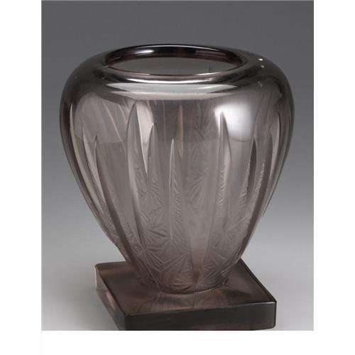 <B>A French Art Glass Vase</B></I><BR><BR>Verlys, France<BR>Circa 1930<BR>Colored glass<BR>Marks: <I>Verlys, France</B></I><BR>7 in. high<BR><BR>The tapering purple body with stylized foliate reserves with frosted and textured fan decoration on square deeper purple base<BR><BR>Provenance: From the collection of Rita and Richard Chouinard.
