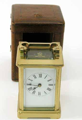 A French carriage timepiece, with enamelled dial, in obis brass case and leather travelling case, 6in. £100-150