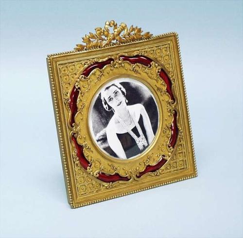 A French gilt bronze and enamel easel picture frame. Square shape with gilt bronze scrolls, inlaid with red enamel panels. Topped with a laurel crown. 7" square. 3000-3500
