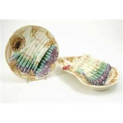 A French majolica style asparagus set, consisting of a dish and six plates moulded with forms of...